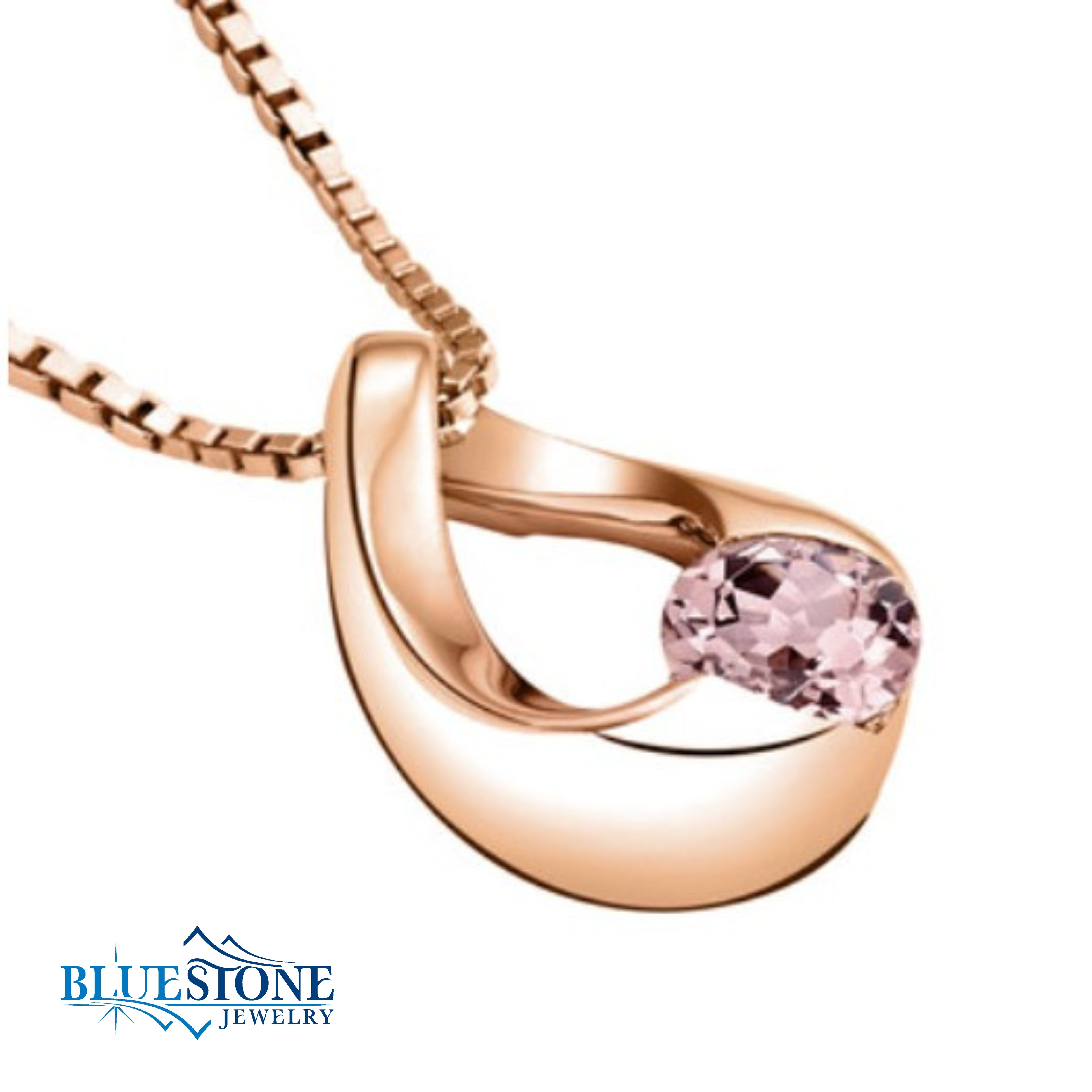 14 Karat Rose Gold Plated Sterling Silver Pendant with One 6mm 1.00 Carat Round Cut Simulated Morganite. Comes on an 18 Inch Sterling Silver Rhodium Plated Box Chain.