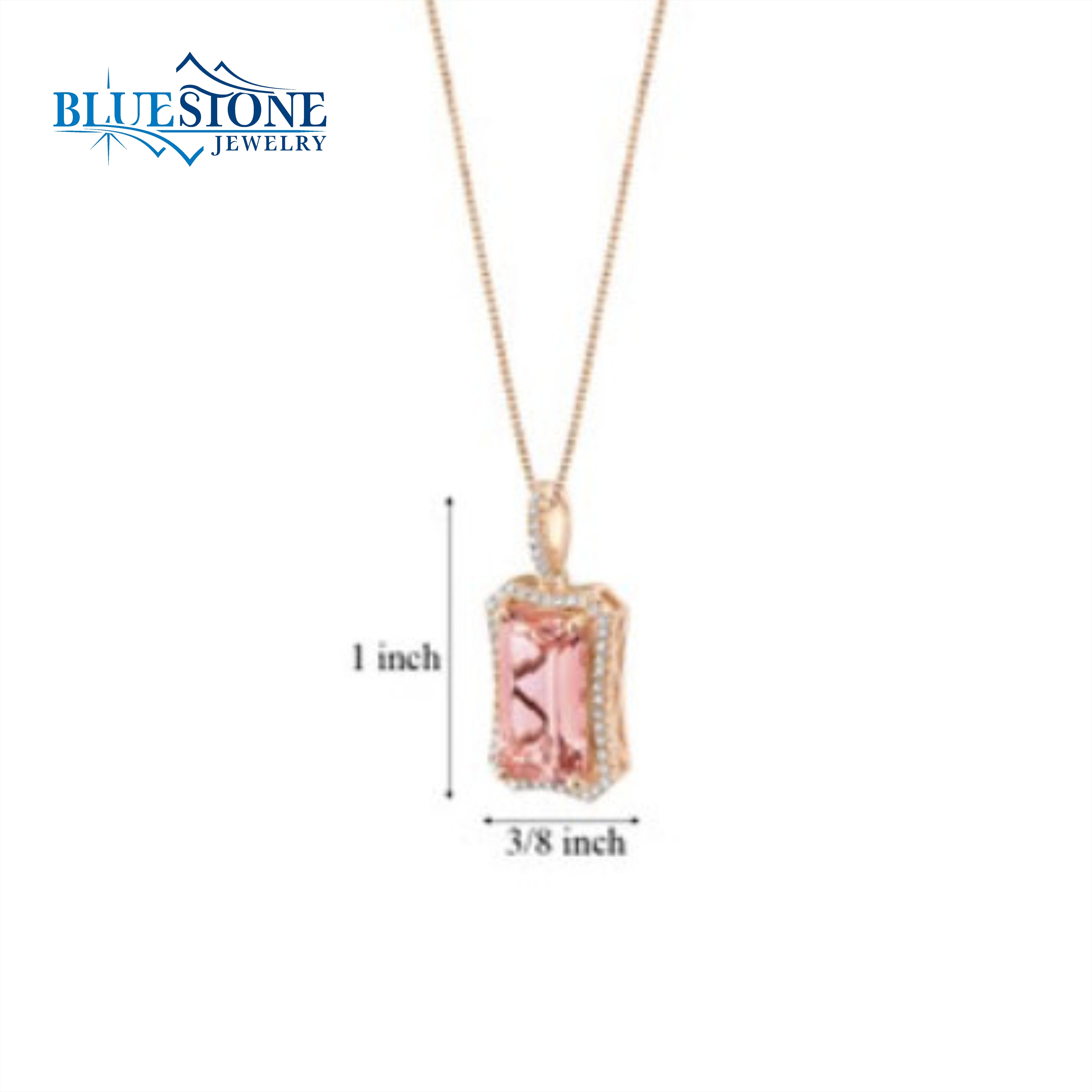 14 Karat Rose Gold Plated Sterling Silver Pendant with One 8mm x 15mm 5.00 Carat Emerald Cut Simulated Morganite and Cubic Zirconia Accents. Comes on an 18 Inch Rose Gold Plated Box Chain.