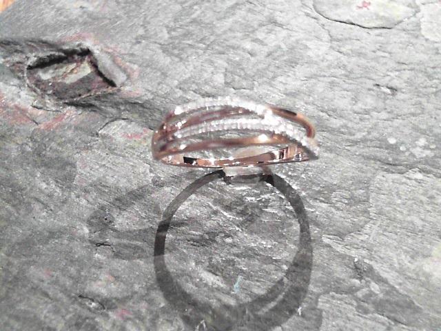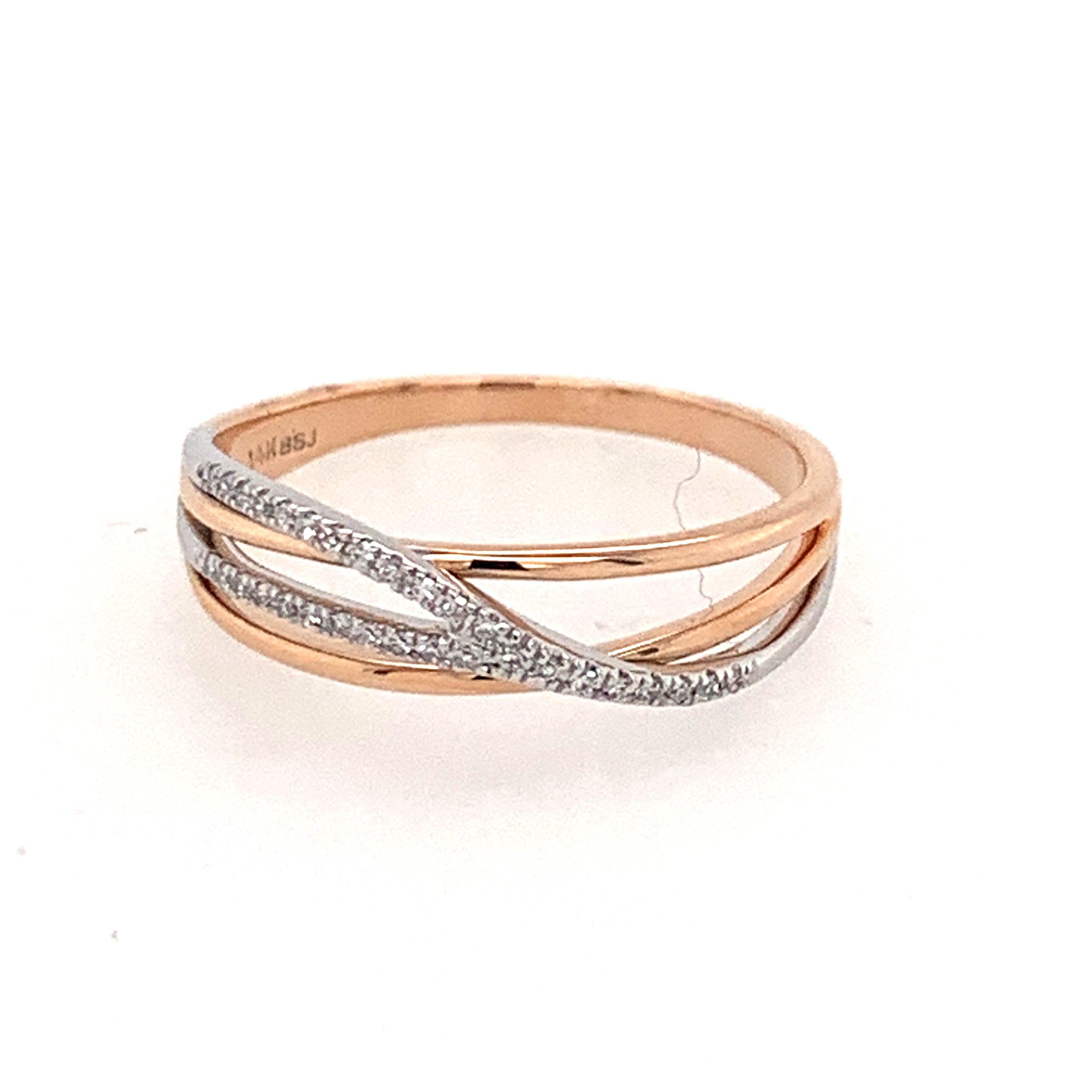 14 Karat White and Rose Gold Fashion Ring or Wedding Band with 31 Round Diamonds 0.06 Carats Total Weight G SI1 quality.Size 7.25 at 1.9 grams at an overall finished weight.Bluestone Jewelry Design