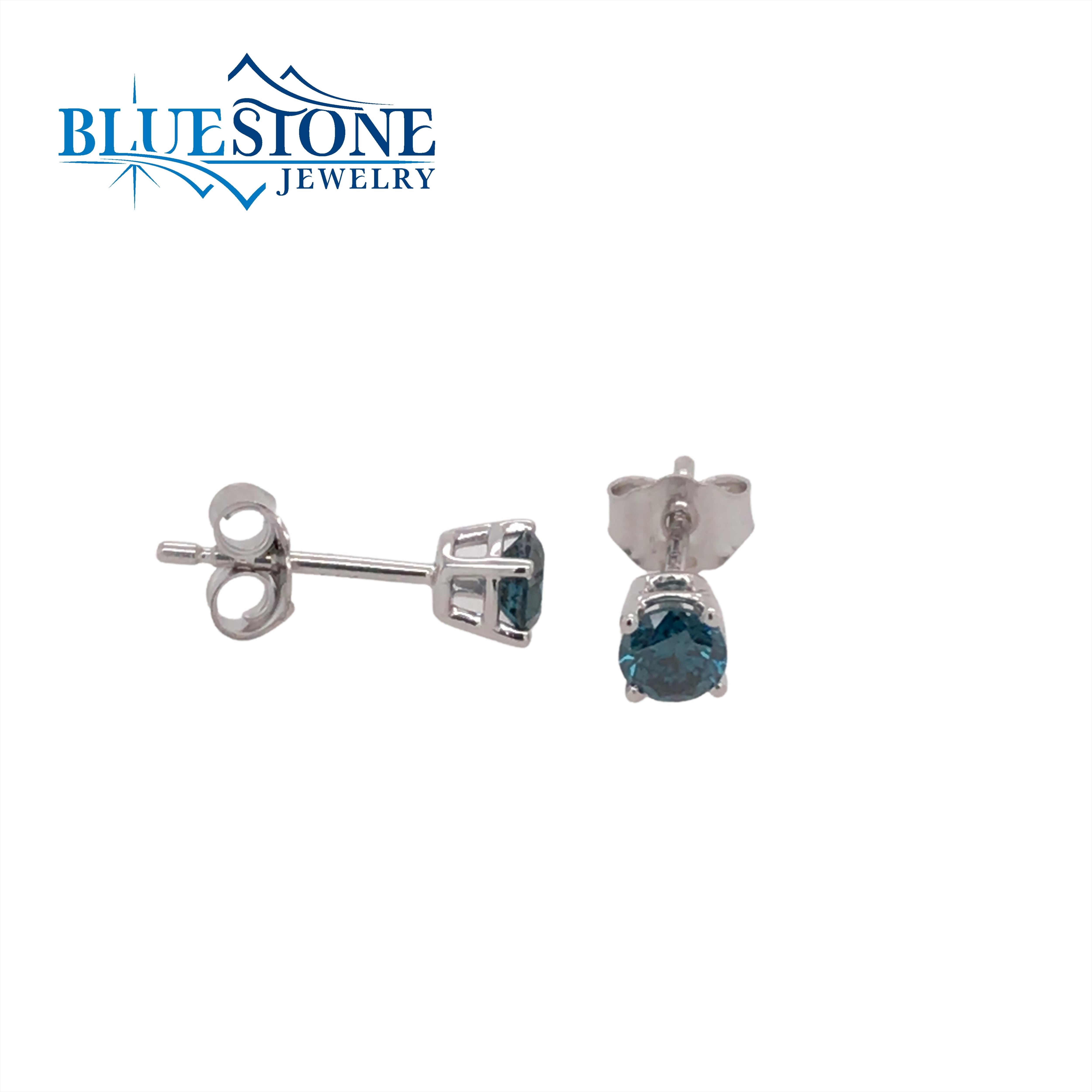 14 Karat White Gold 4 Prong Stud Earrings w/ Blue Diamonds at 0.50cttw