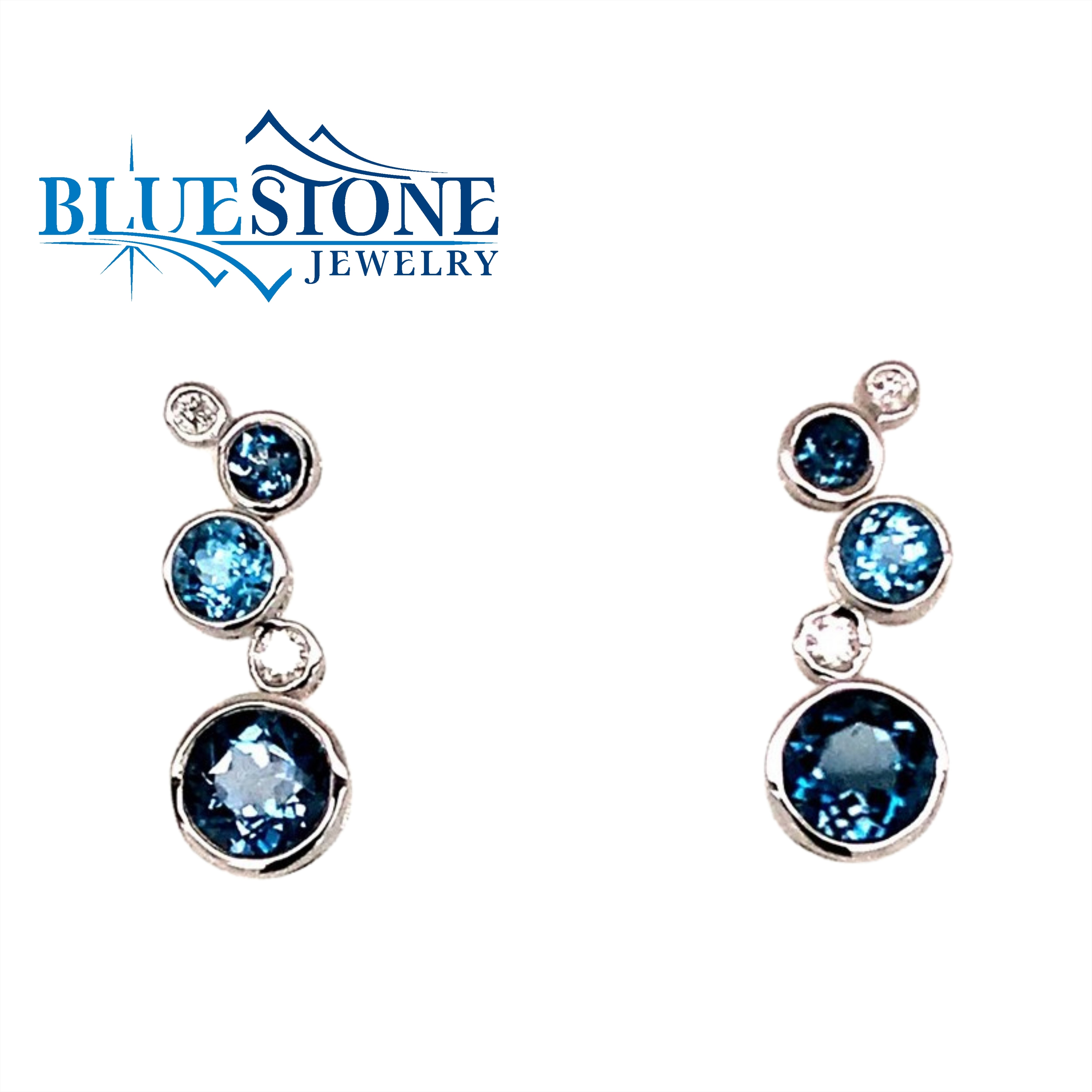 14 Karat White Gold Earrings with 2.27 Carats Total Weight of Round Blue Topaz London Blue Topaz and Swiss Blue Topaz and 4 Round Diamonds at 0.13 Carats Total Weight.*****Bluestone Collection*****