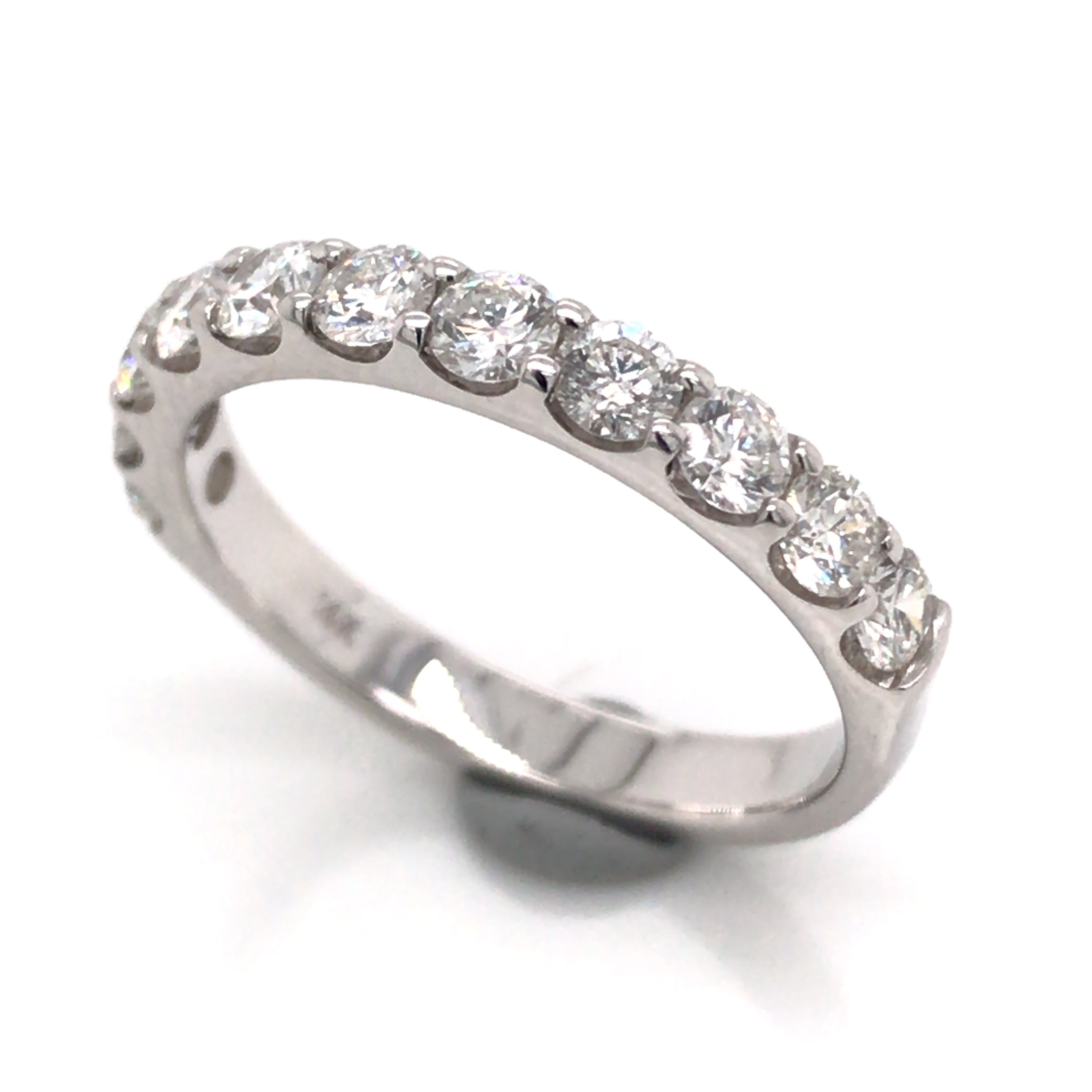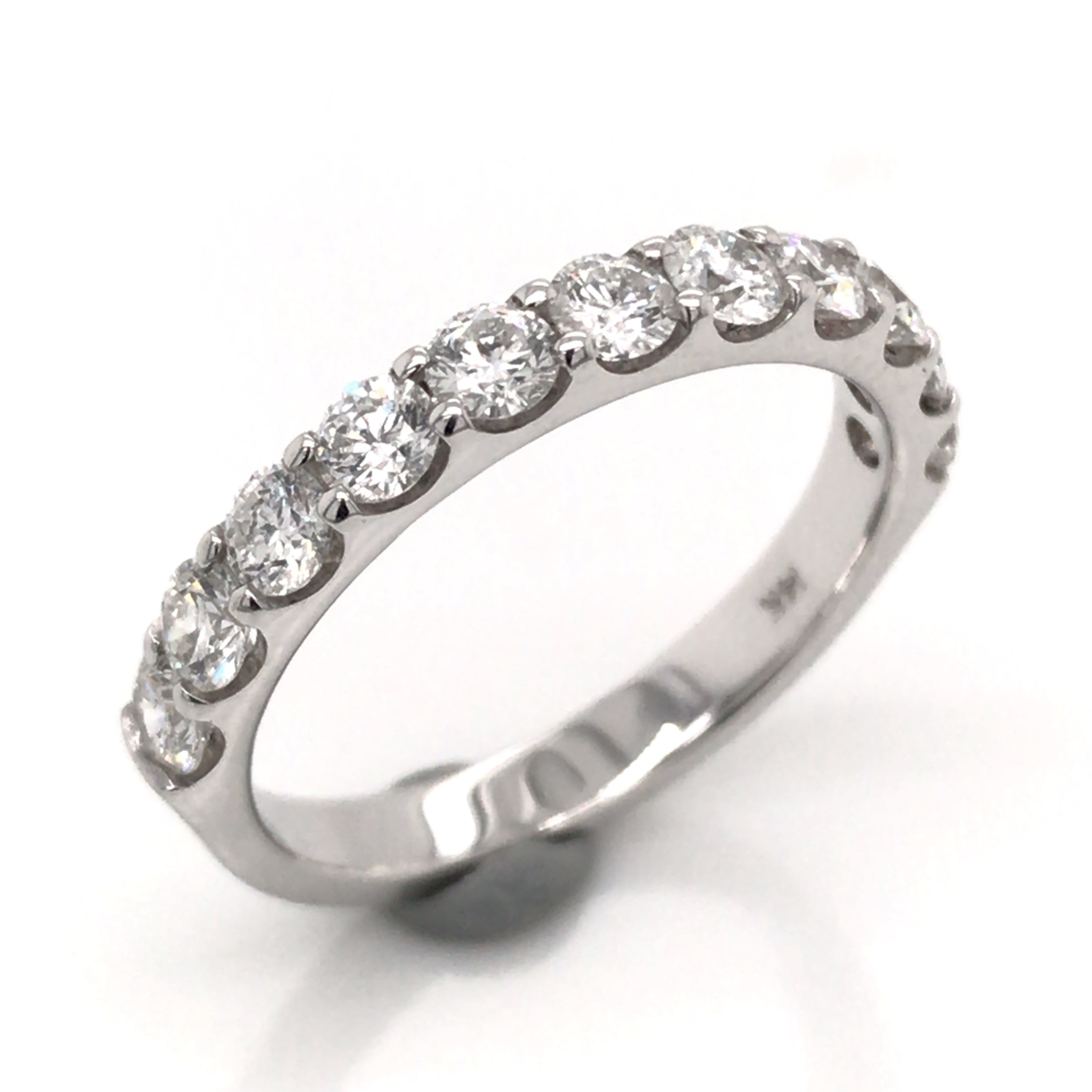 14 Karat White Gold Shared Prong Wedding Band with 11 Round Diamonds at 1.00 Carats Total Weight of G/H SI Diamonds. Ring Size 6.5. BLUE DOT ITEM