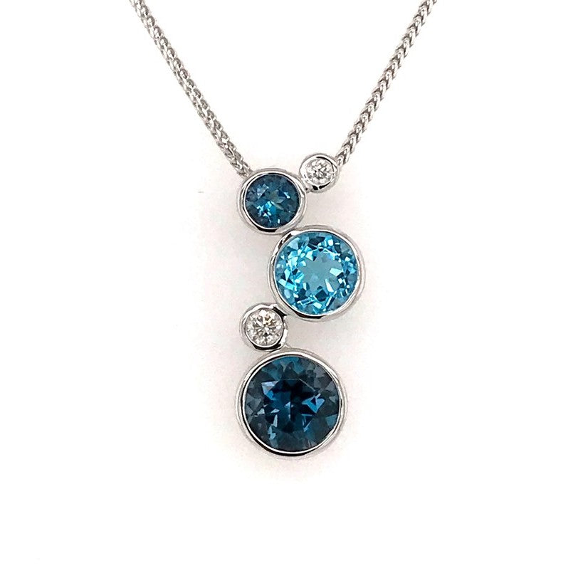 14 Karat White Gold Pendant with 2.30 Carats Total Weight of Round Blue Topaz (London Blue Topaz and Swiss Blue Topaz) and 2 Round Diamonds at 0.10 Carats Total Weight.Chain is sold separately. Comes on a metal alloy DISPLAY chain.
