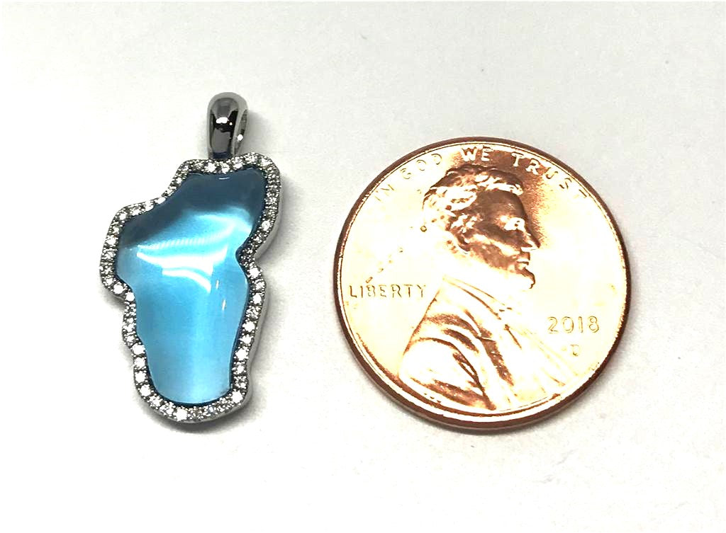 14 Karat White Gold Pendant with a 3.16 Carat Lake Tahoe Shaped Light Blue Hydro Permanently Treated Gemstone & 51 Round Diamonds Surrounding Lake Tahoe at 0.15 Carats Total Weight of G SI1 Quality Diamonds. Bluestone Jewelry Exclusive Design.