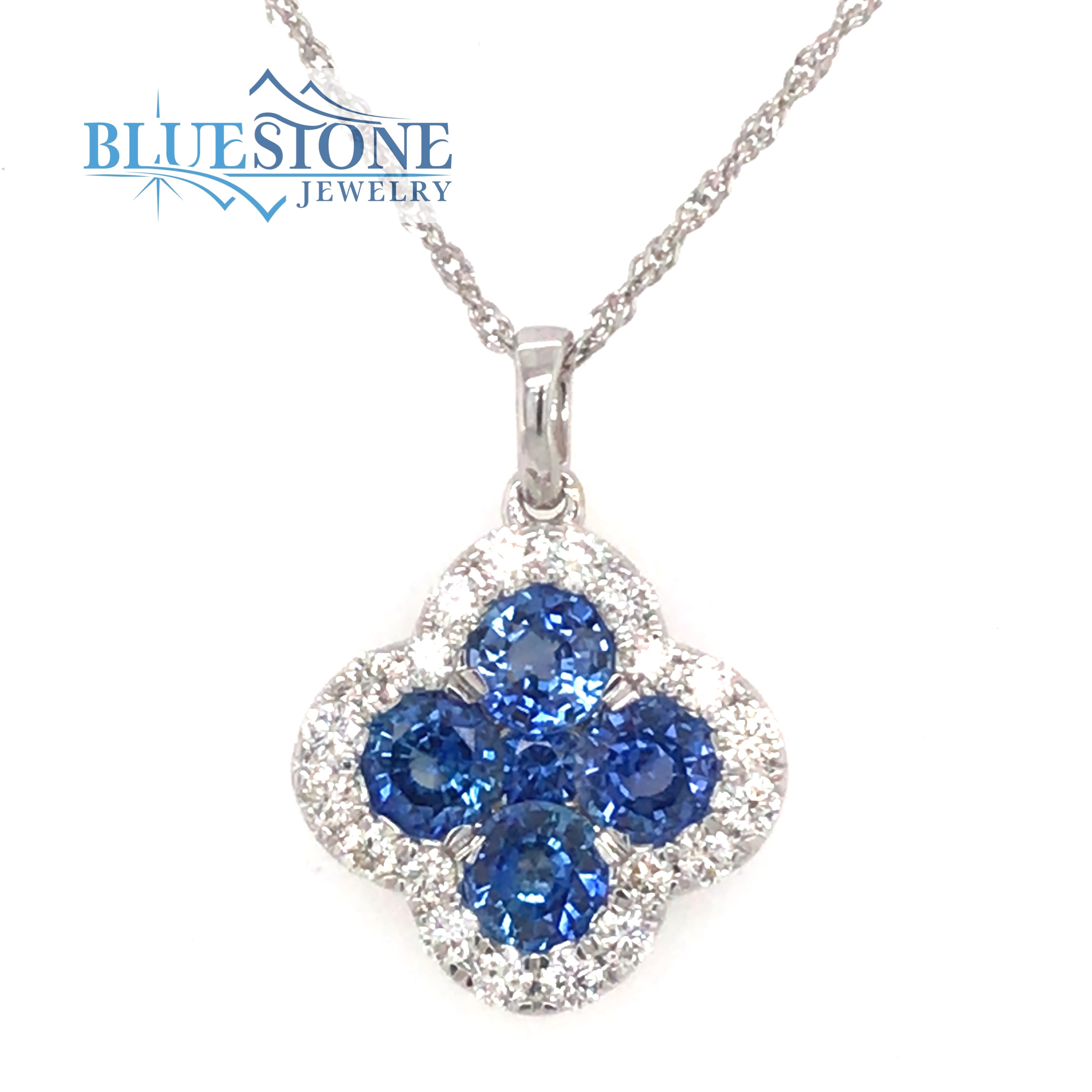14 Karat White Gold Pendant with Five Round Sapphires at 1.20 Total Carat Weight and Diamond Accents at 0.38 Total Carat Weight. Measures 1/2" x 3/4". Comes on a 16 Inch 14 Karat White Gold Chain.