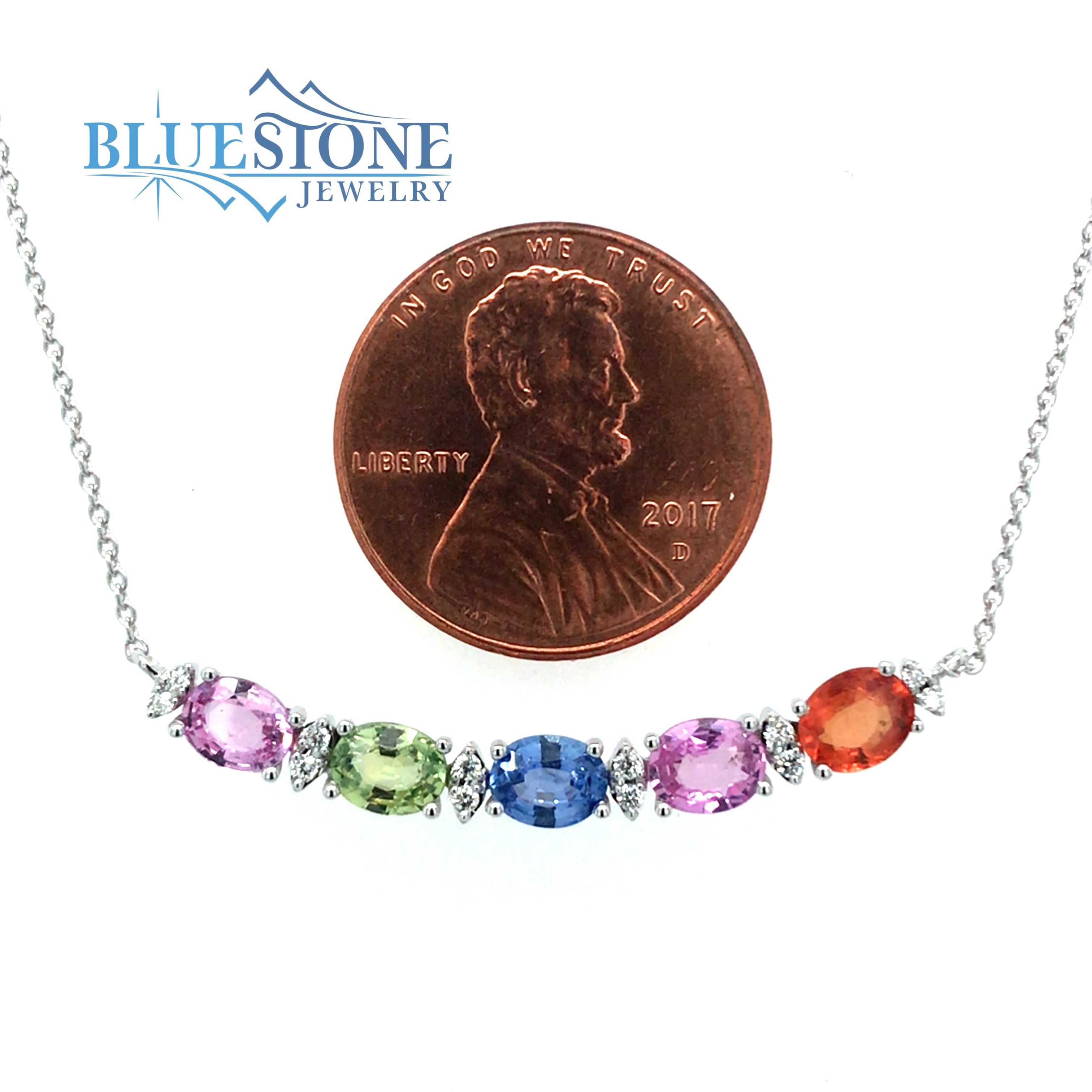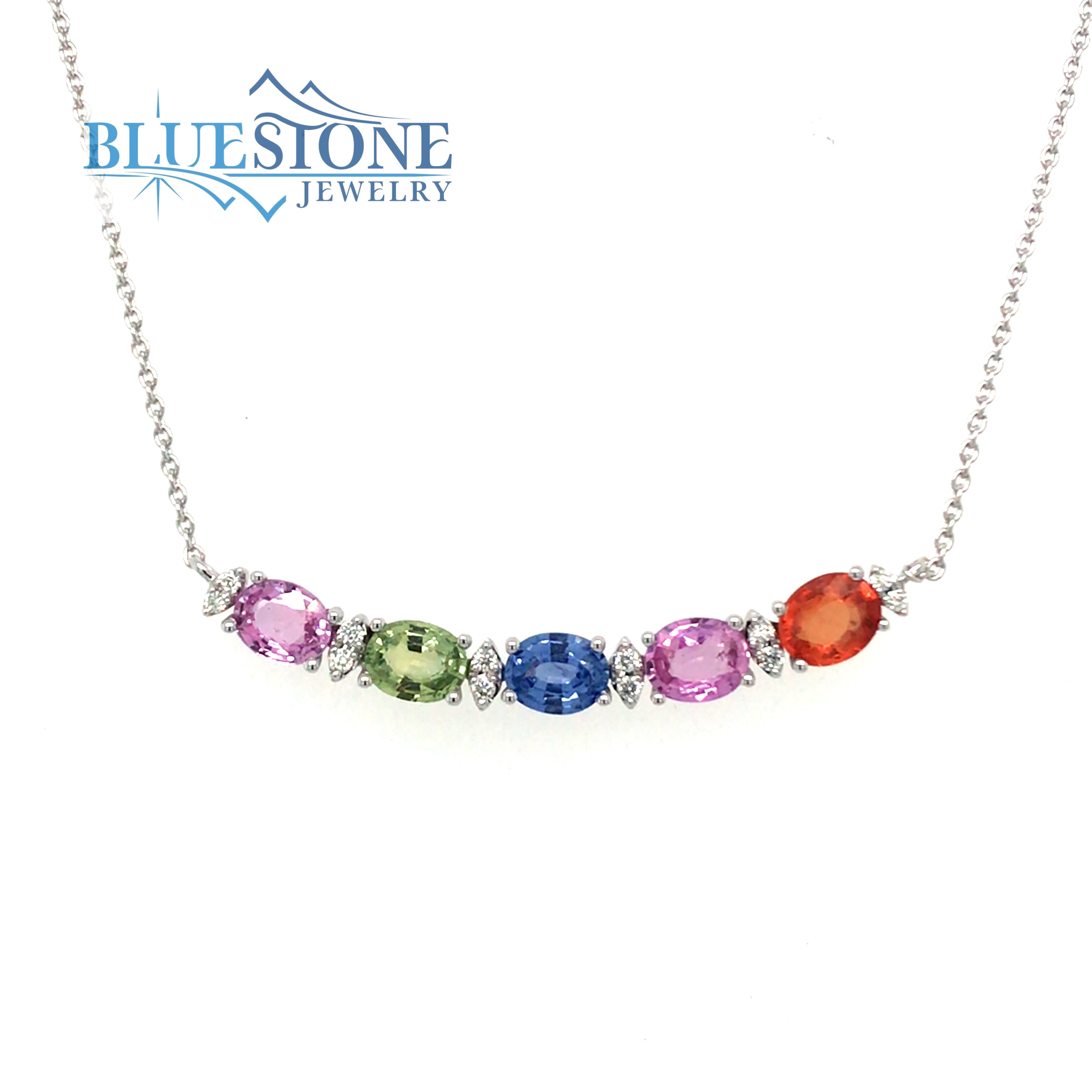 14 Karat White Gold Rainbow Necklace with Five 4mm x 5mm Oval Cut Multicolored Sapphires at 2.16 Total Carat Weight and 12 Round Diamonds at 0.07 Total Diamond Carat Weight G SI1 Quality. Pendant Measures 1.25 Inches Long.Comes on a 14 Karat White Gold 1mm Wide Rolo Chain. Necklace Measures 17 Inches Long in Total.Bluestone Jewelry Design.