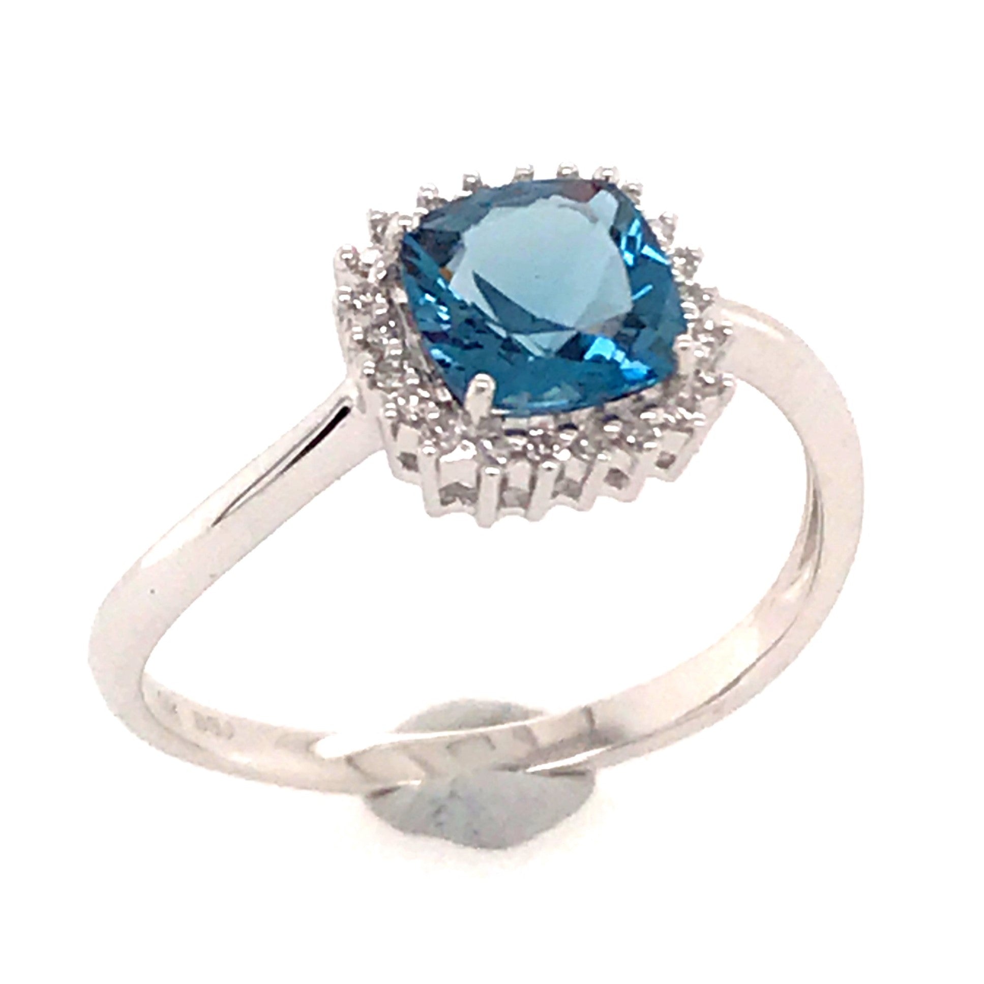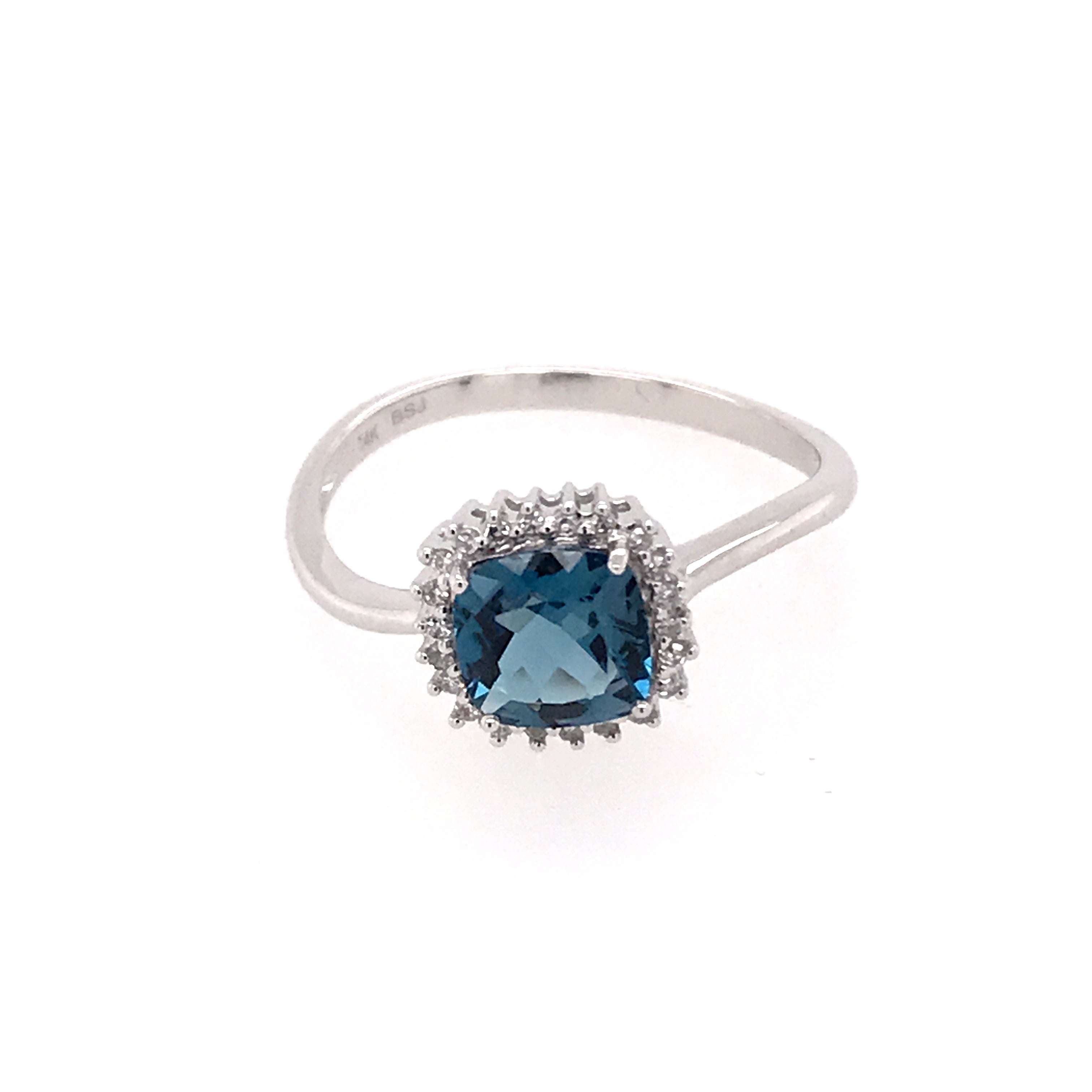 14 Karat White Gold Ring with a 0.98 Carat Square Cushion Cut London Blue Topaz and 22 Round Diamonds at 0.06 Carats Total Weight.Ring Size 7.5.