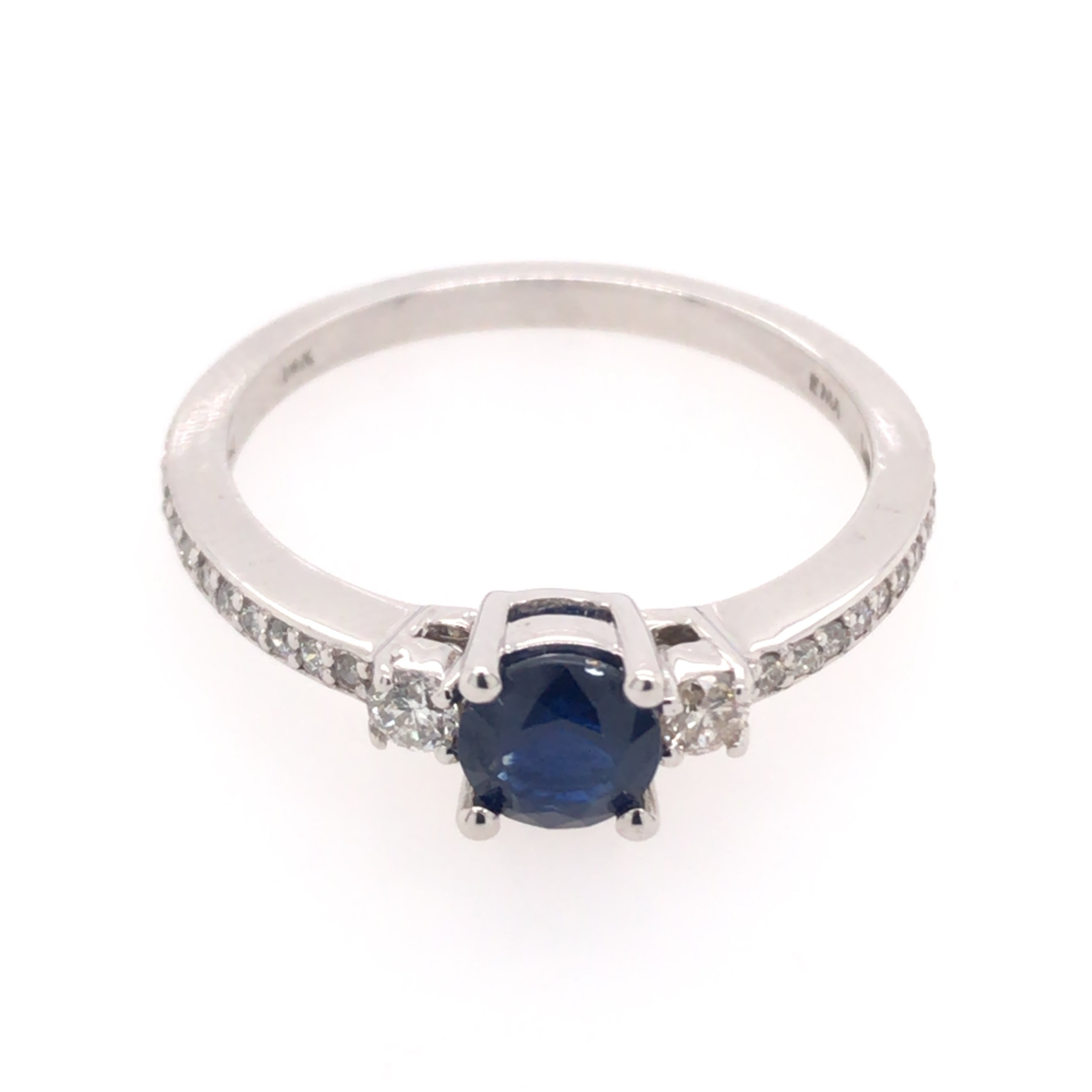 14 Karat White Gold Ring with a 0.48 Carat Round Blue Sapphire and Round Diamonds at 0.21 Carats Total Weigh G/H SI Quality.Ring Size 6.75