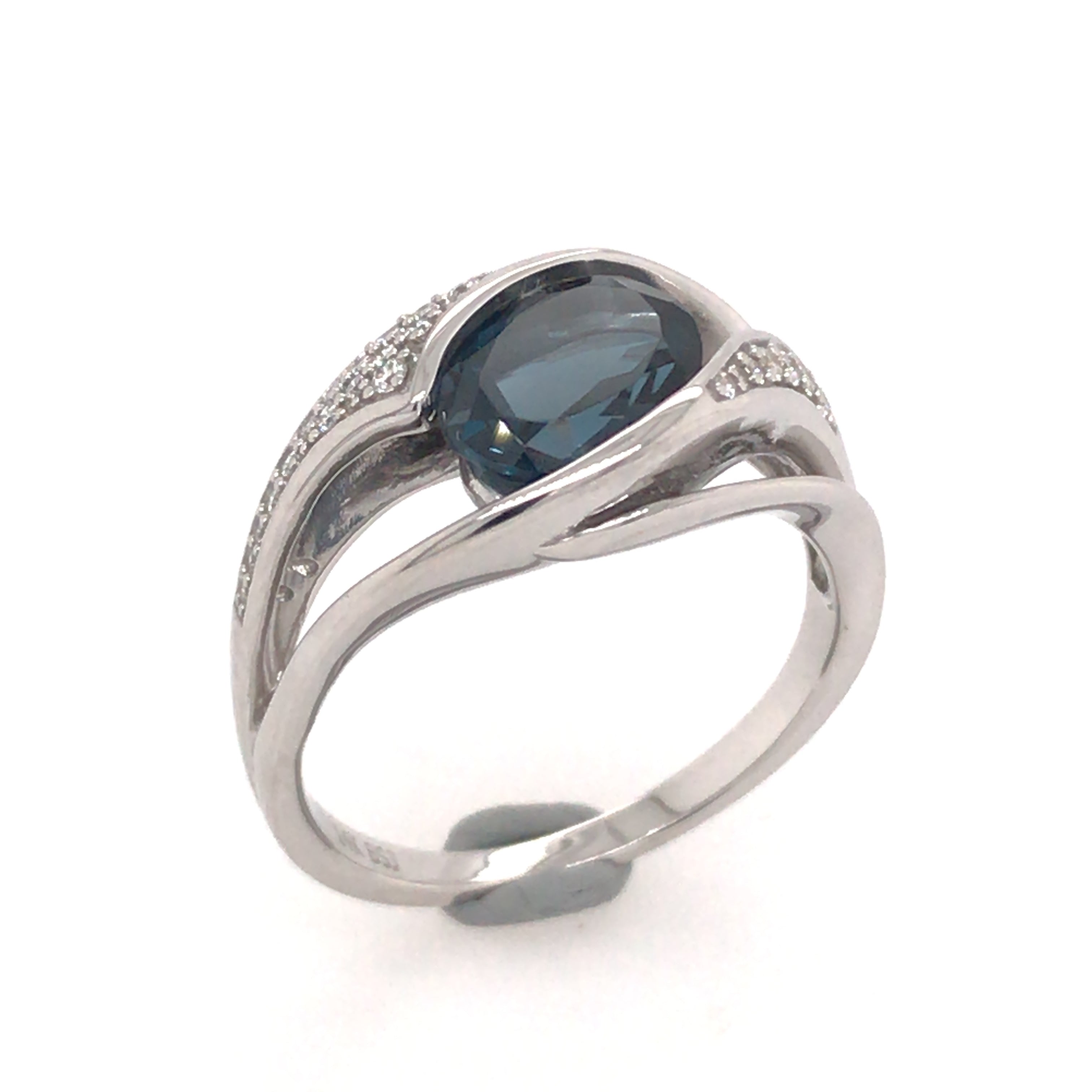 14 Karat White Gold Ring with London Blue Topaz and Diamonds- Size 6