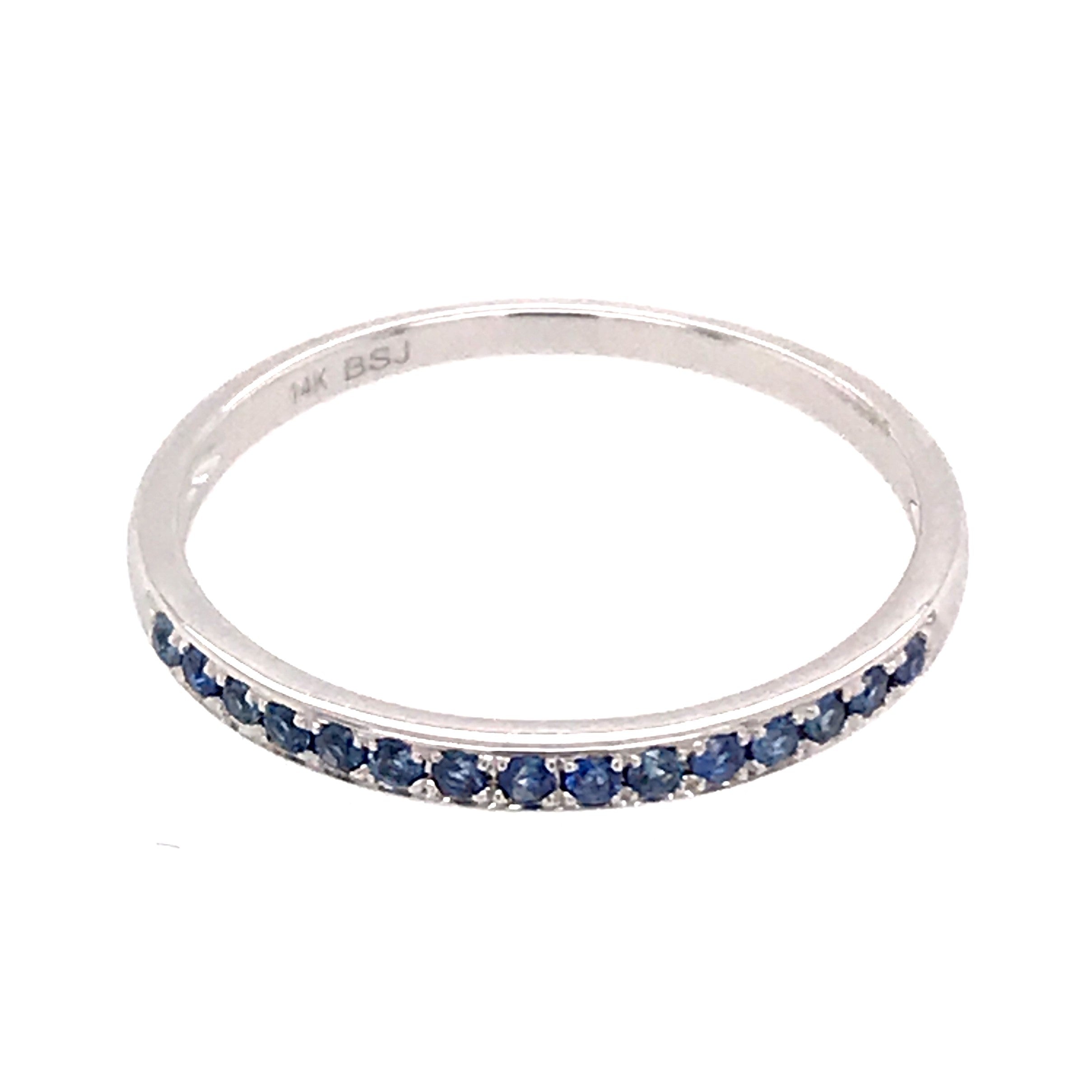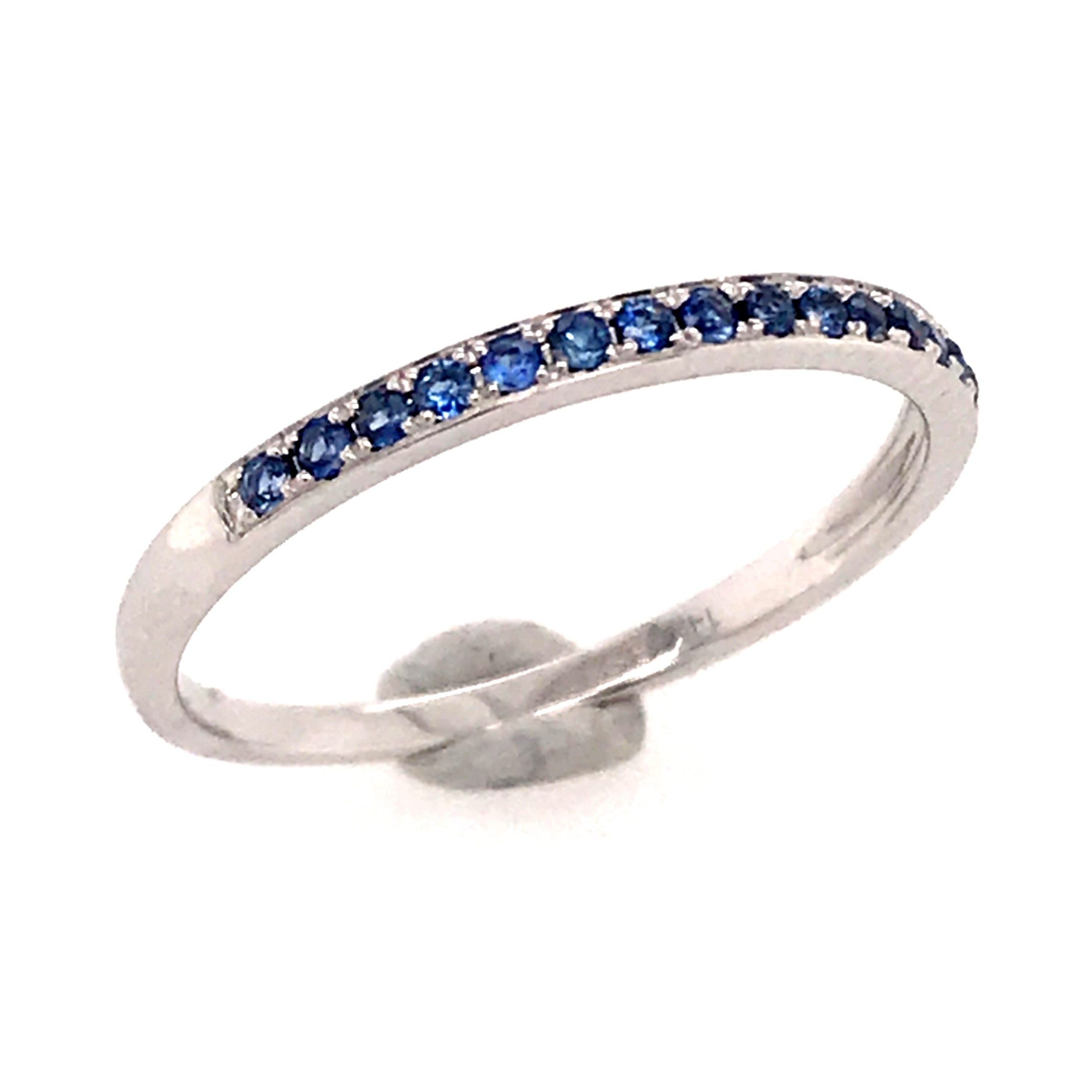 14 Karat White Gold Ring with 15 Round Blue Sapphires at 0.22 Carats Total Weight. Overall Total Finished Weight of 1.2 Grams.Ring Size 7.Can be special ordered or re-sized per request. Please contact for details.