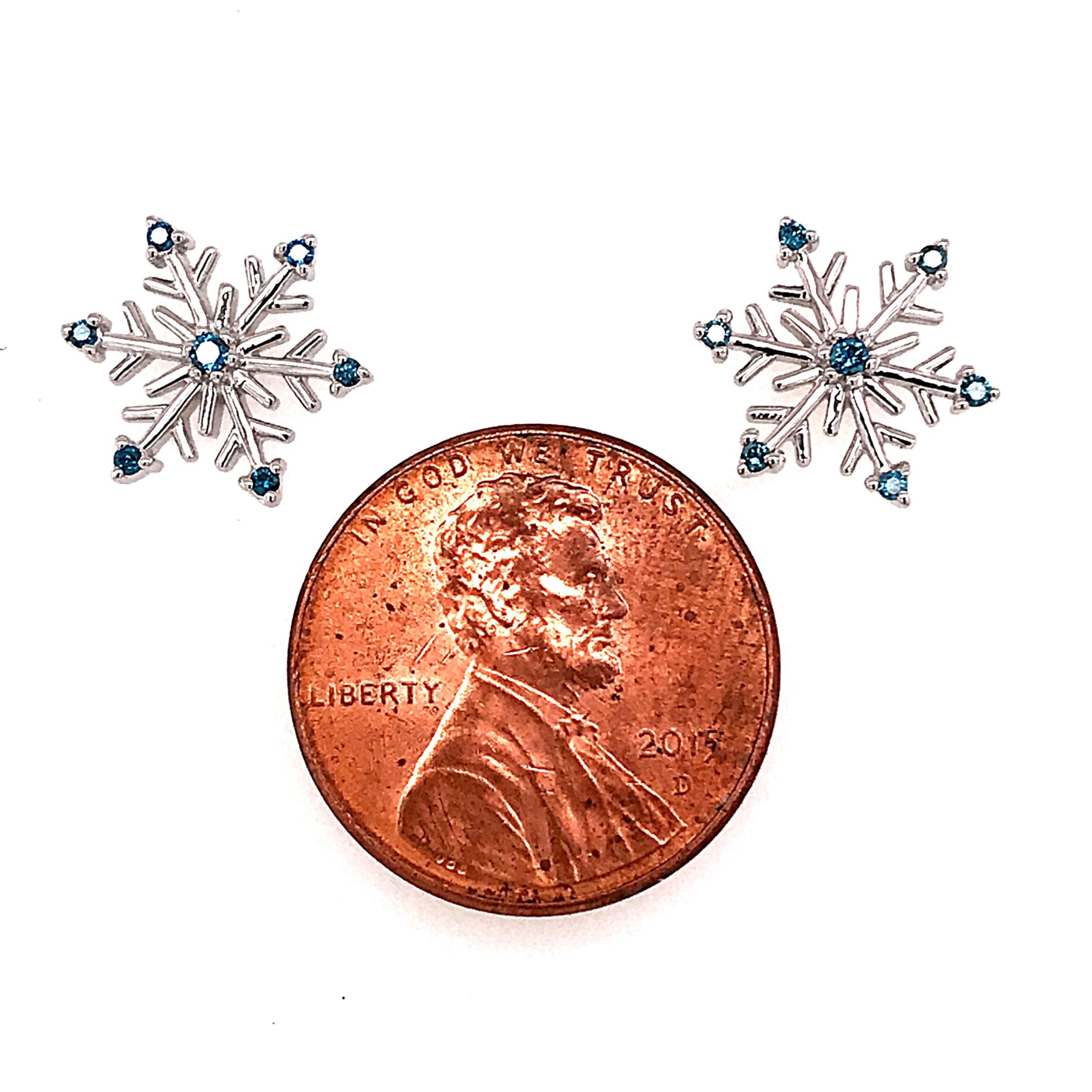 14 Karat White Gold Snowflake Stud Earrings with 14 Round Blue Diamonds at 0.12 Carats Total Weight. Earrings Measure 1/2" Wide.