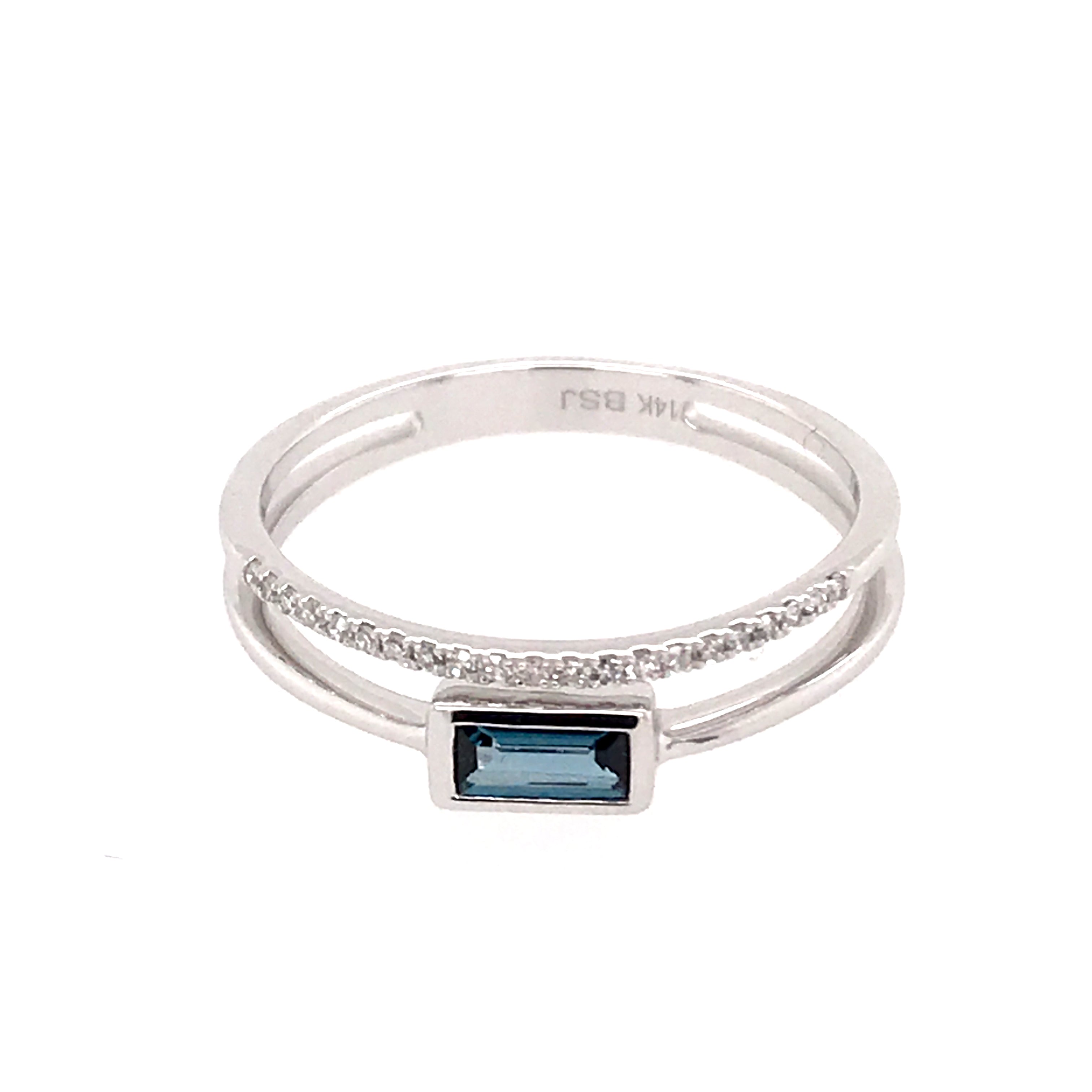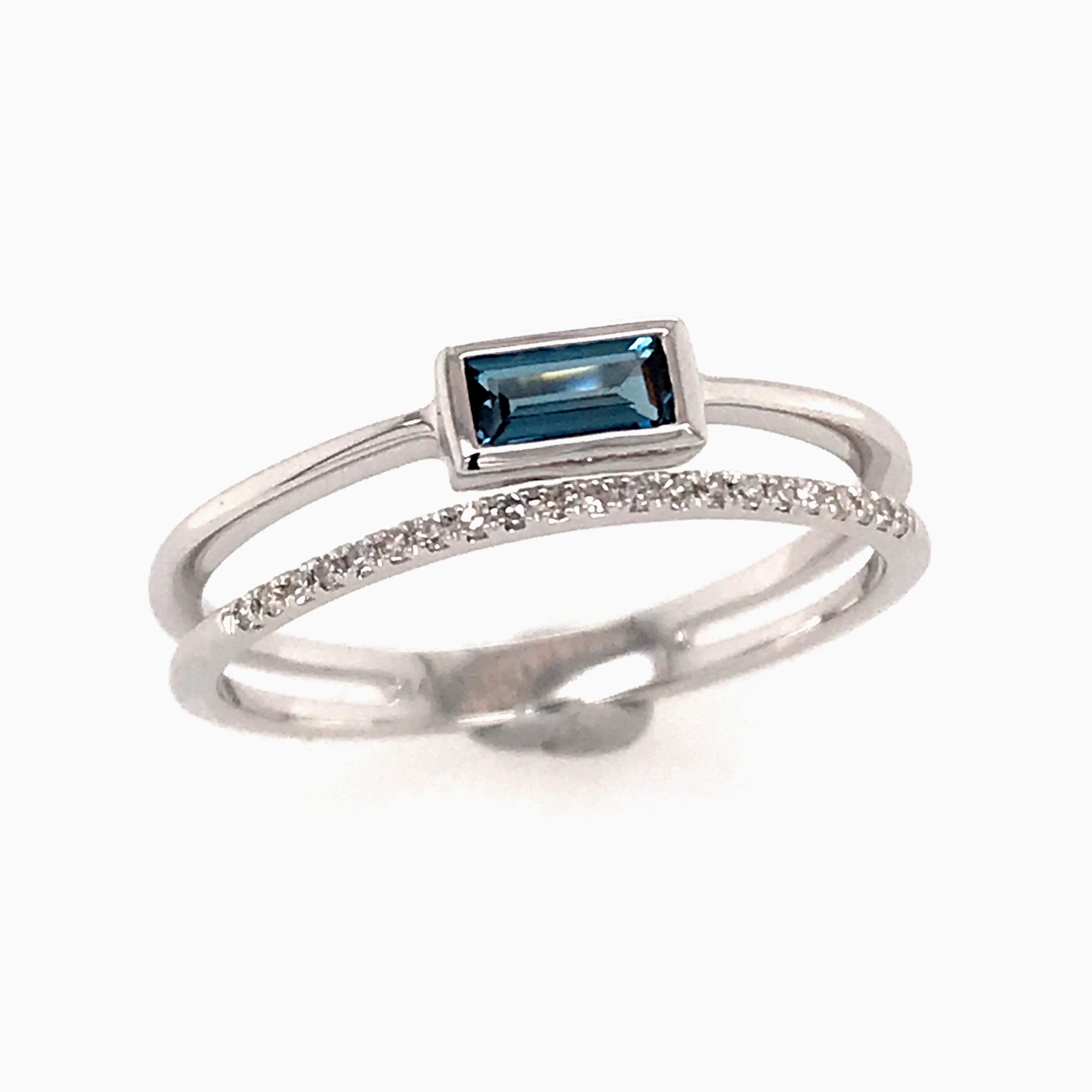 14 Karat White Gold Ring with a 0.26 Carat 5 x 2.5mm Emerald Cut London Blue Topaz & 21 Round Diamonds at 0.05 Carats Total Weight G SI1 Quality Diamonds.Ring Size 7.25.Can be special ordered or re-sized per request. Please contact for details. Pricing may vary.