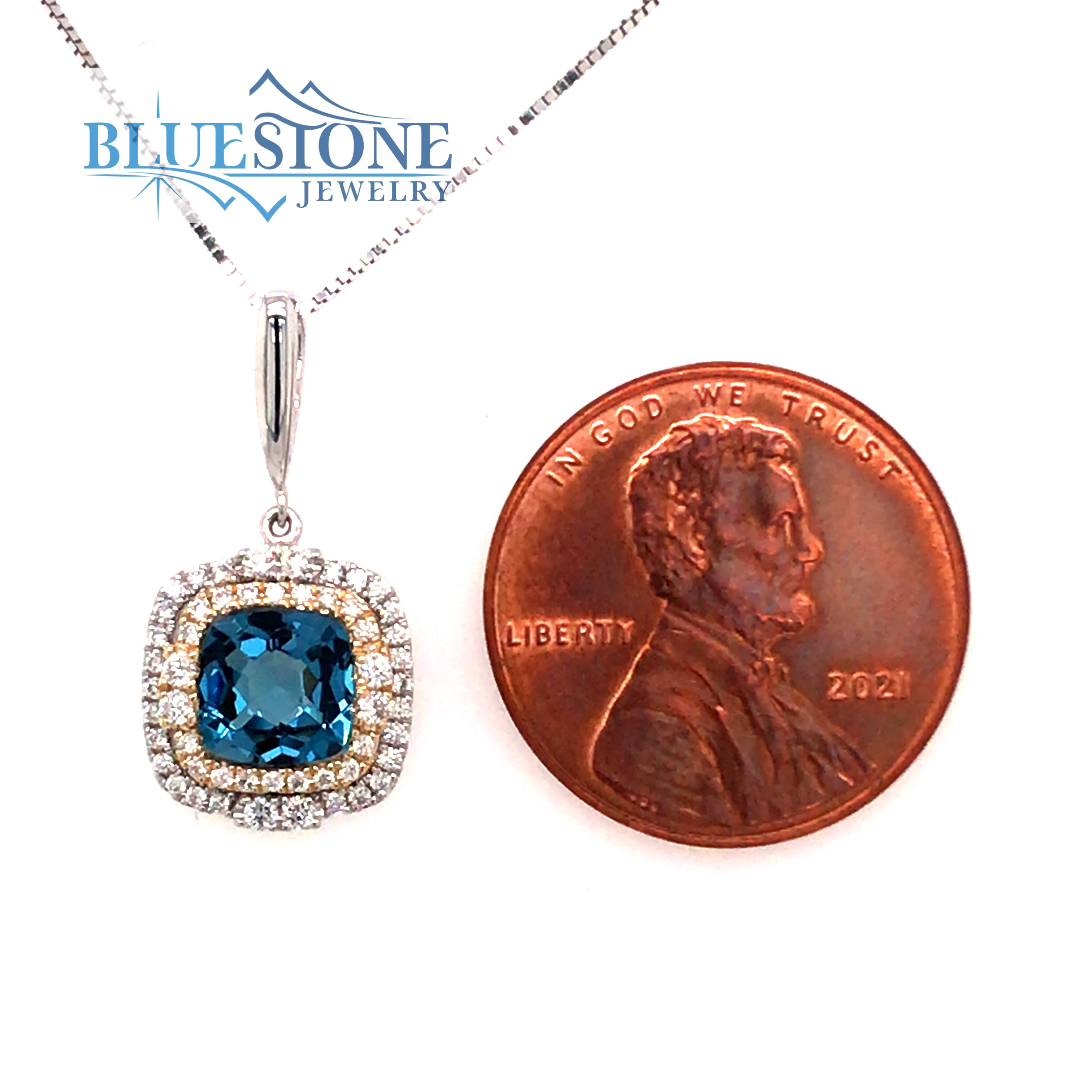 14 Karat White & Yellow Gold Pendant with a 1.08 Carat Square Cushion Cut London Blue Topaz and 52 Diamonds at 0.20 Carats Total Weight of G SI1 Quality Diamonds.Measures Approximately 3/8" x 7/8".Chain is sold separately. Comes on an 18" metal alloy DISPLAY chain.