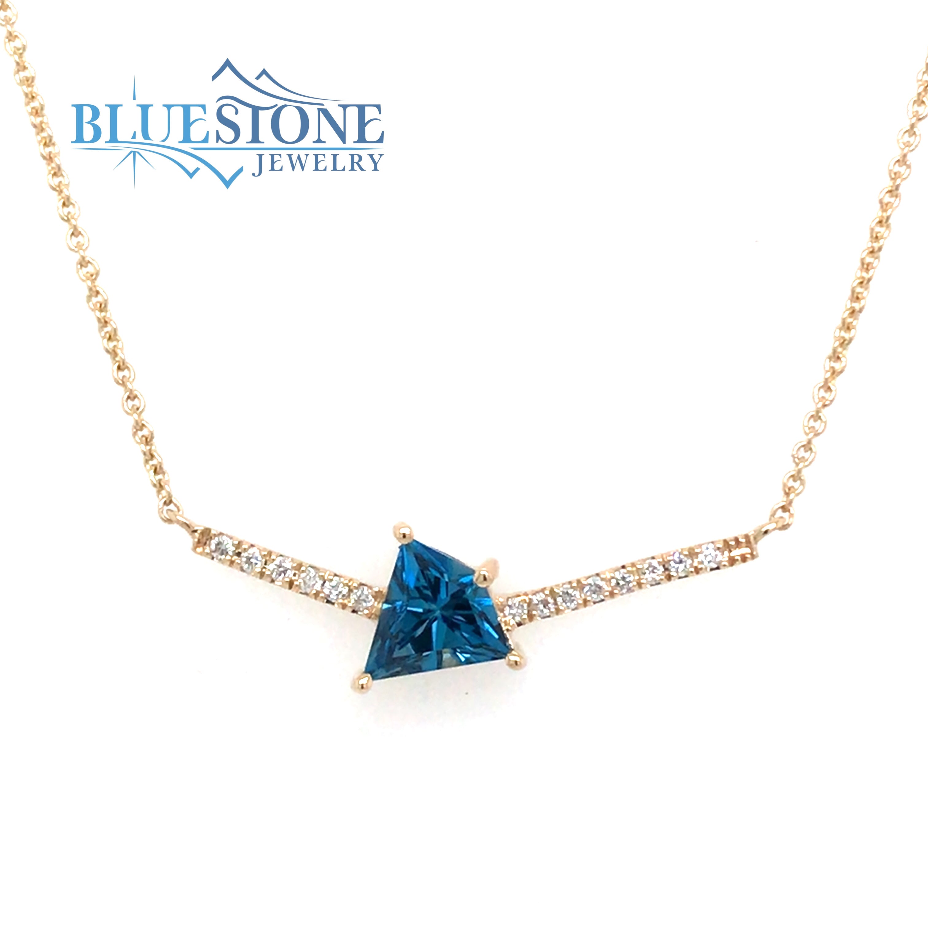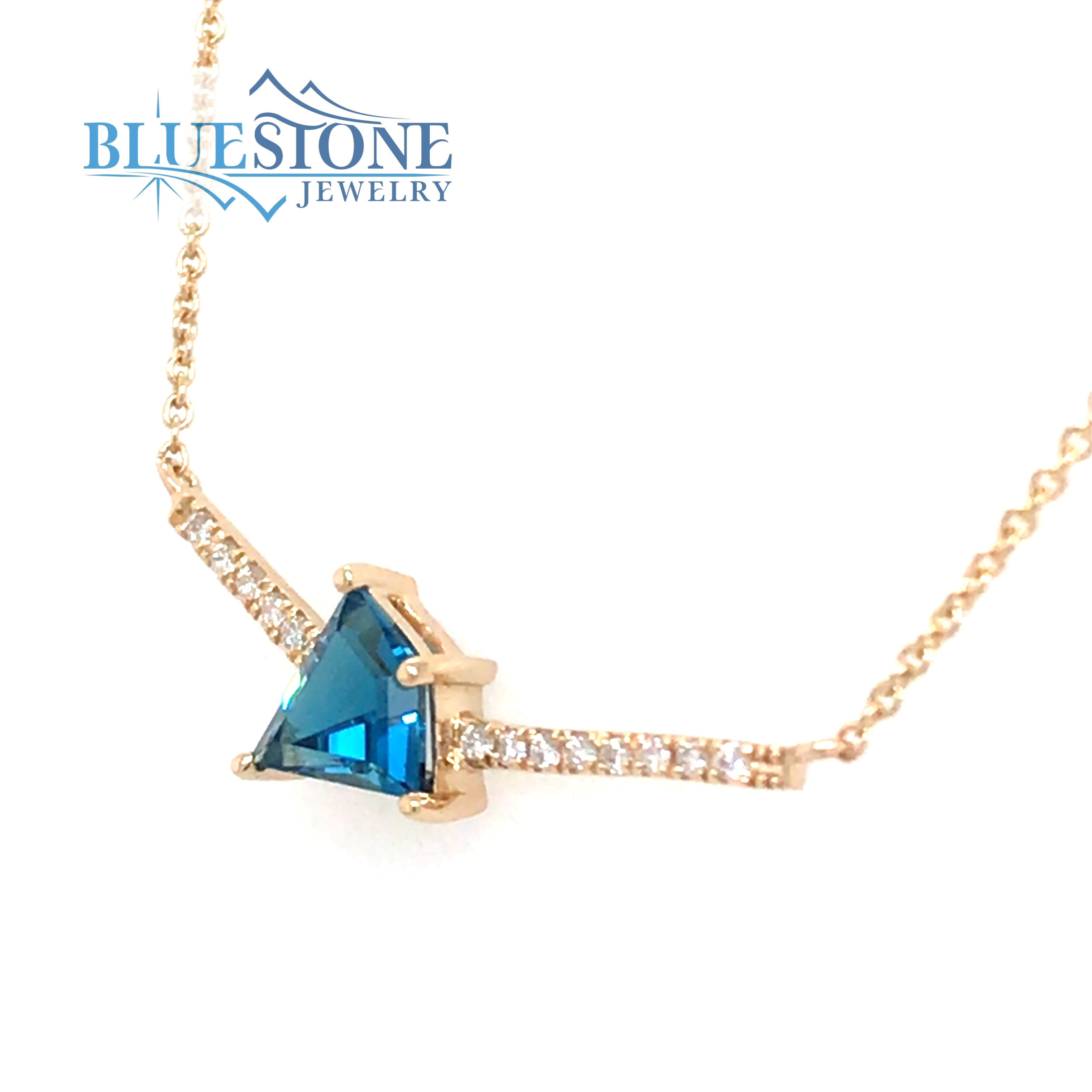 14 Karat Yellow Gold 16 inch Necklace with a 0.87 Carat London Blue Topaz and 14 Round Diamonds at 0.08 Carats Total Weight of G SI1 Quality Diamonds.