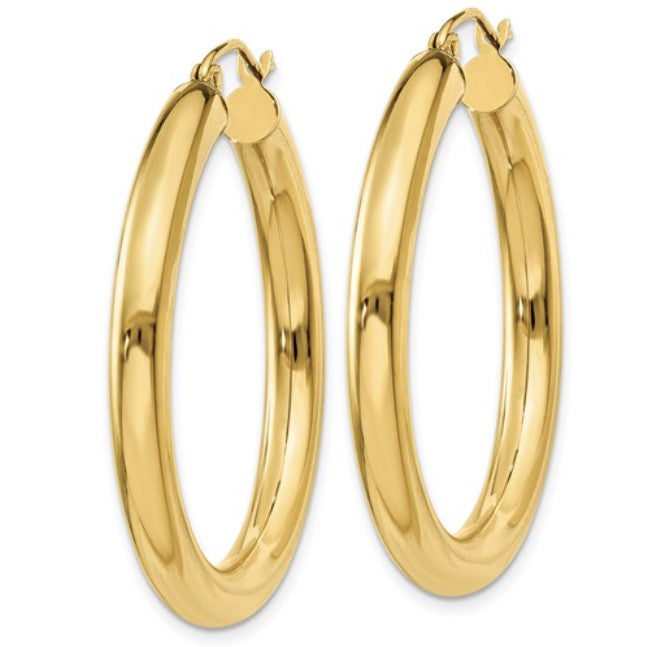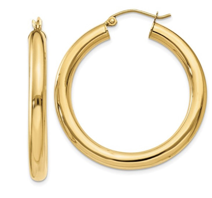 14 Karat Yellow Gold 4mm Tube Hoop Classic Earring. 35mm in length