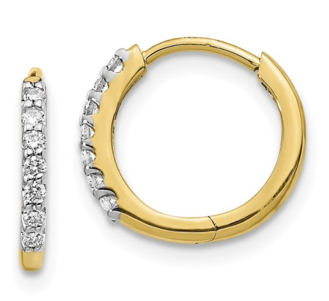 14 Karat Yellow Gold Diamond Hinged Hoop Earrings with 14 Round Diamonds at 0.14 Carats Total Weight.Hoops Measure 12mm x 13mm x 1.5mm.