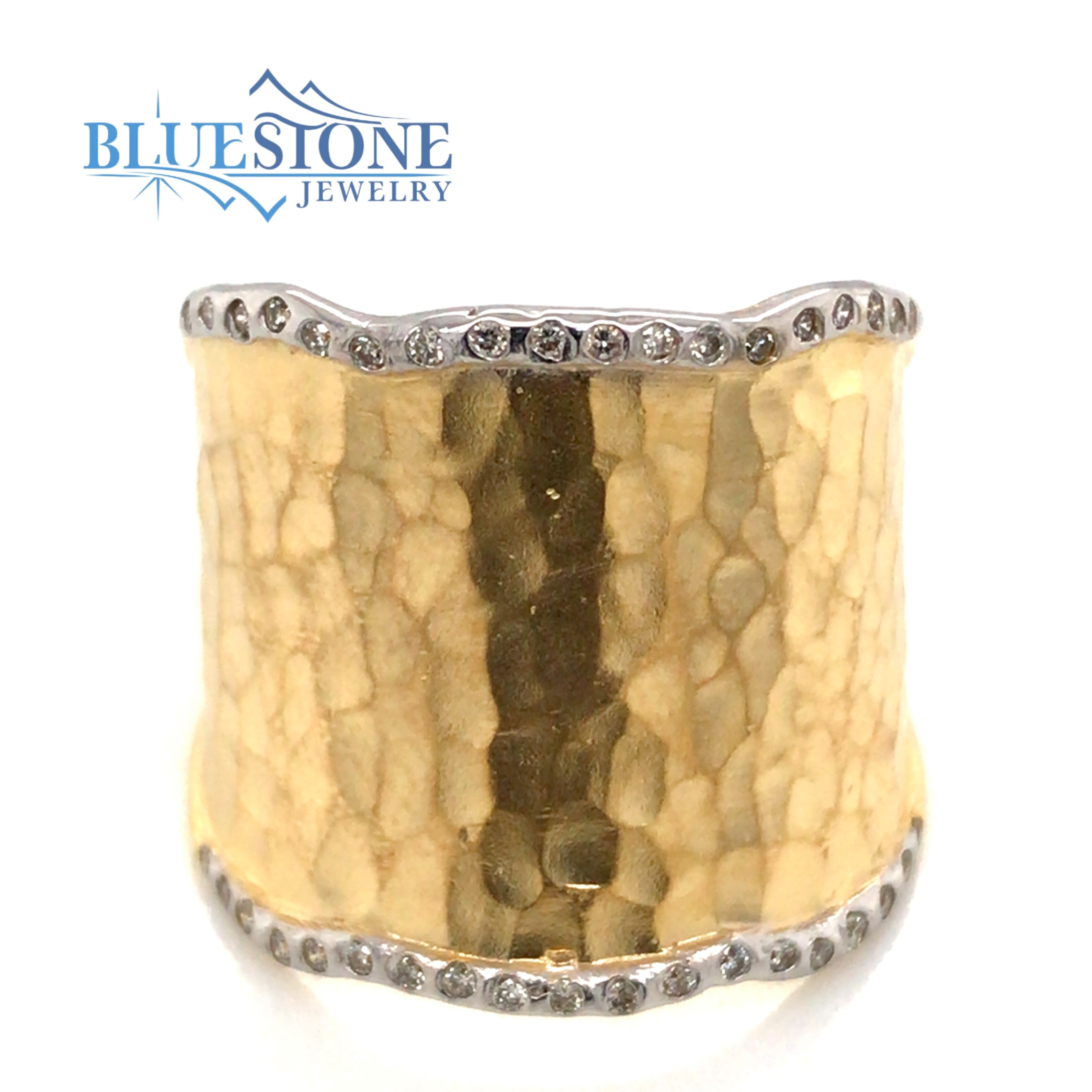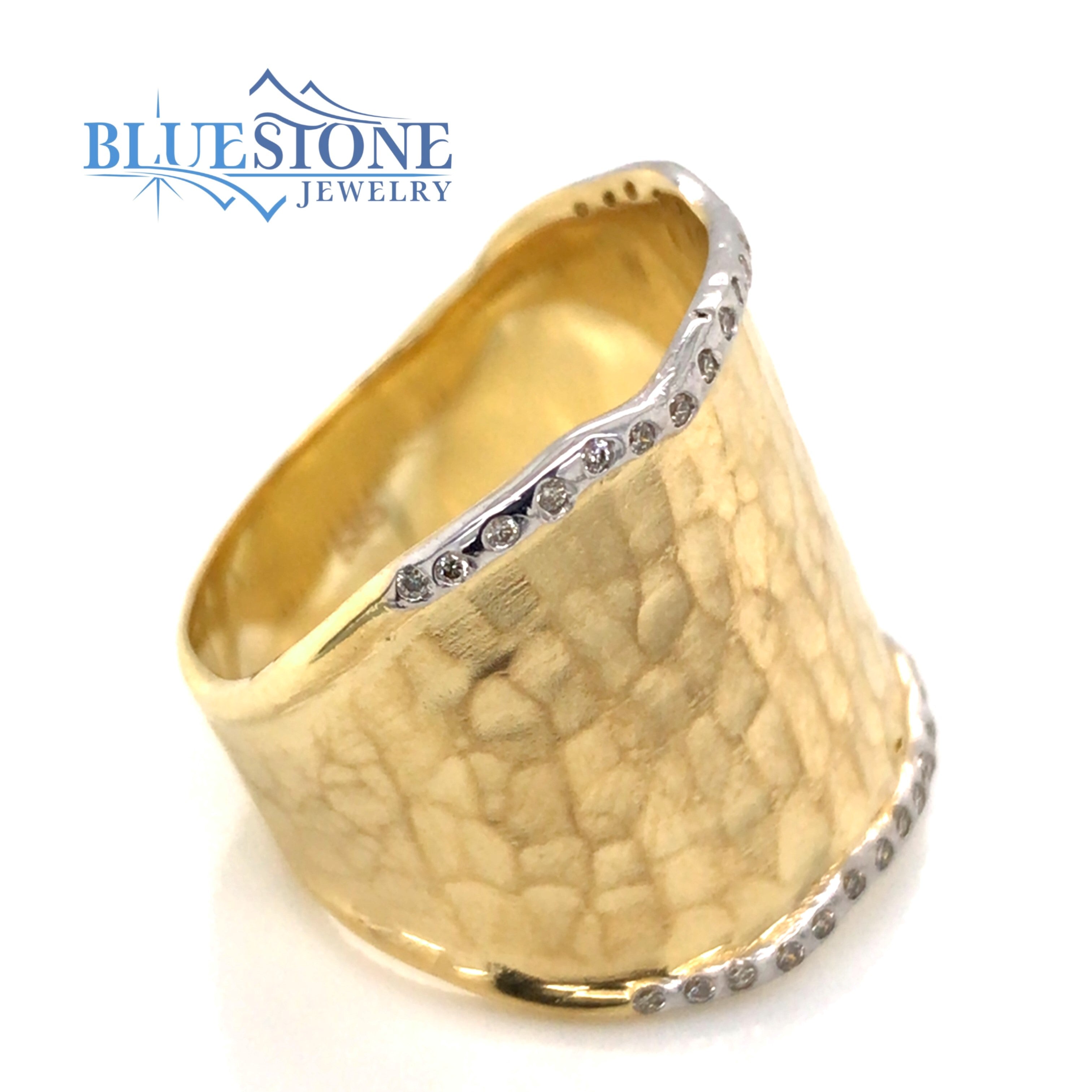 14 Karat Yellow Gold Ring with Matte Hammer Finish Featuring White Gold Burnish Set Diamonds at 0.25 Total Carat Weight.Ring Size 8.25.Other ring sizes are available through special order. Please inquire.