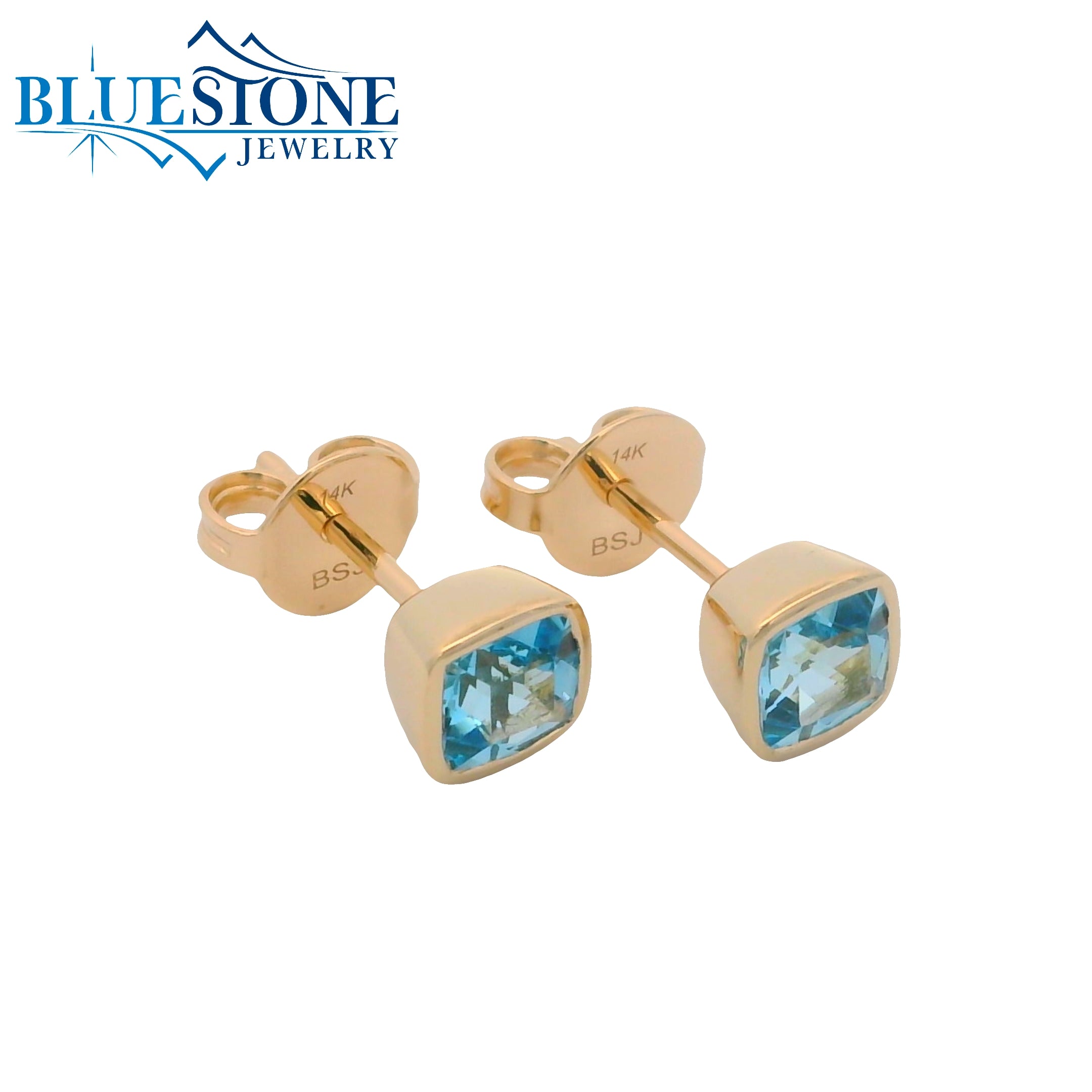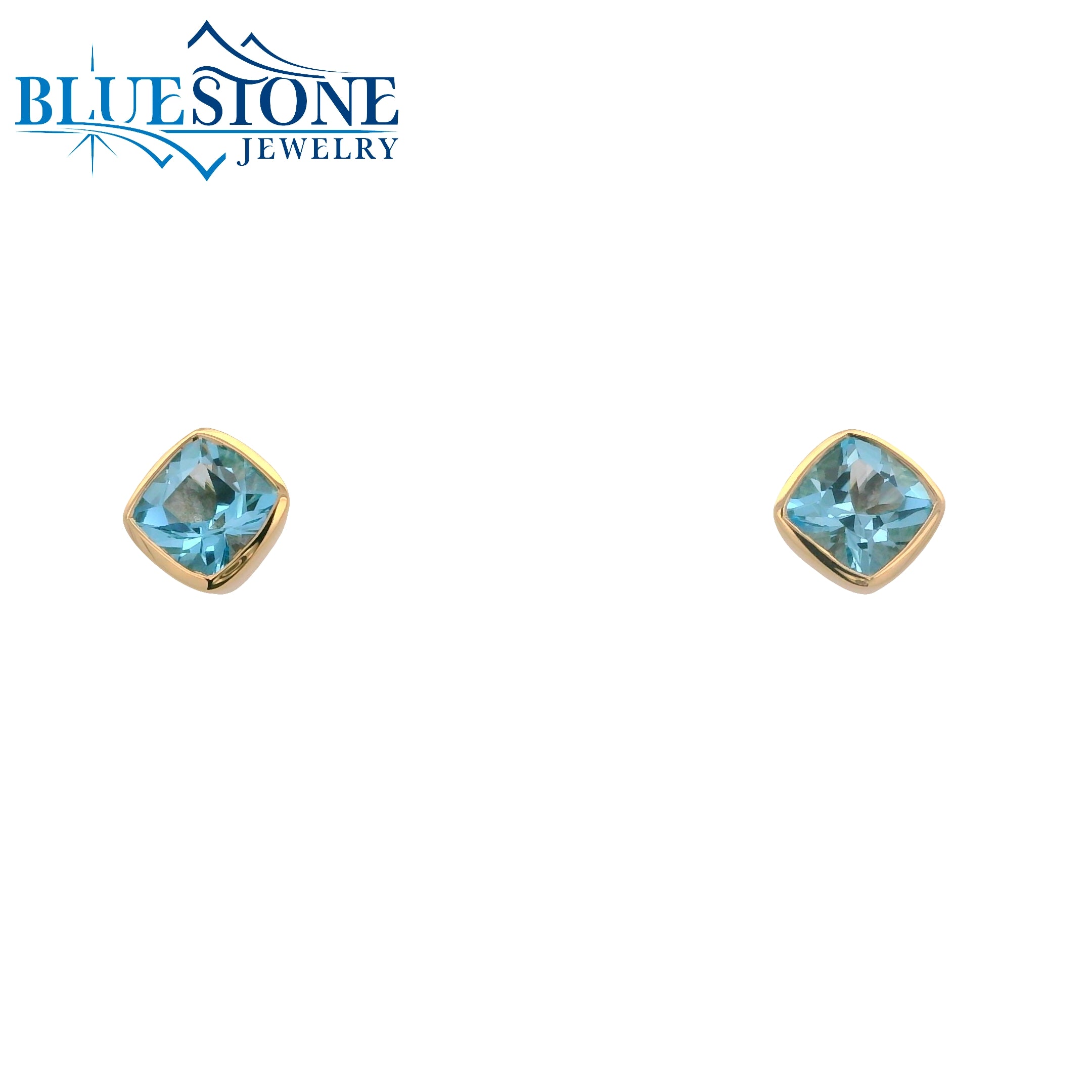 14 Karat Yellow Gold Stud Earrings with Two Square Cushion Cut Blue Topaz Gemstones at 1.35 Carats Total Weight. Measure Approximately 6mm Wide.