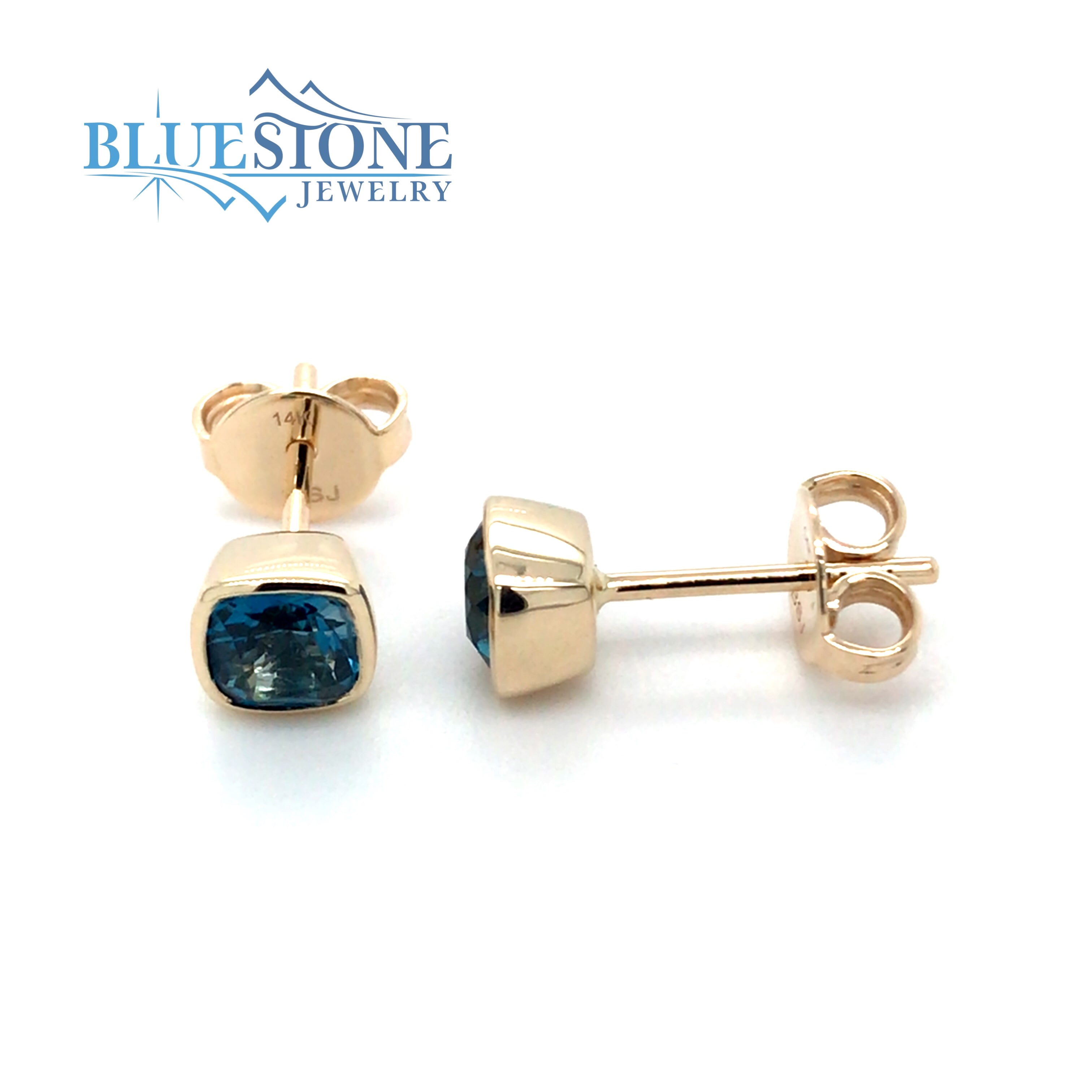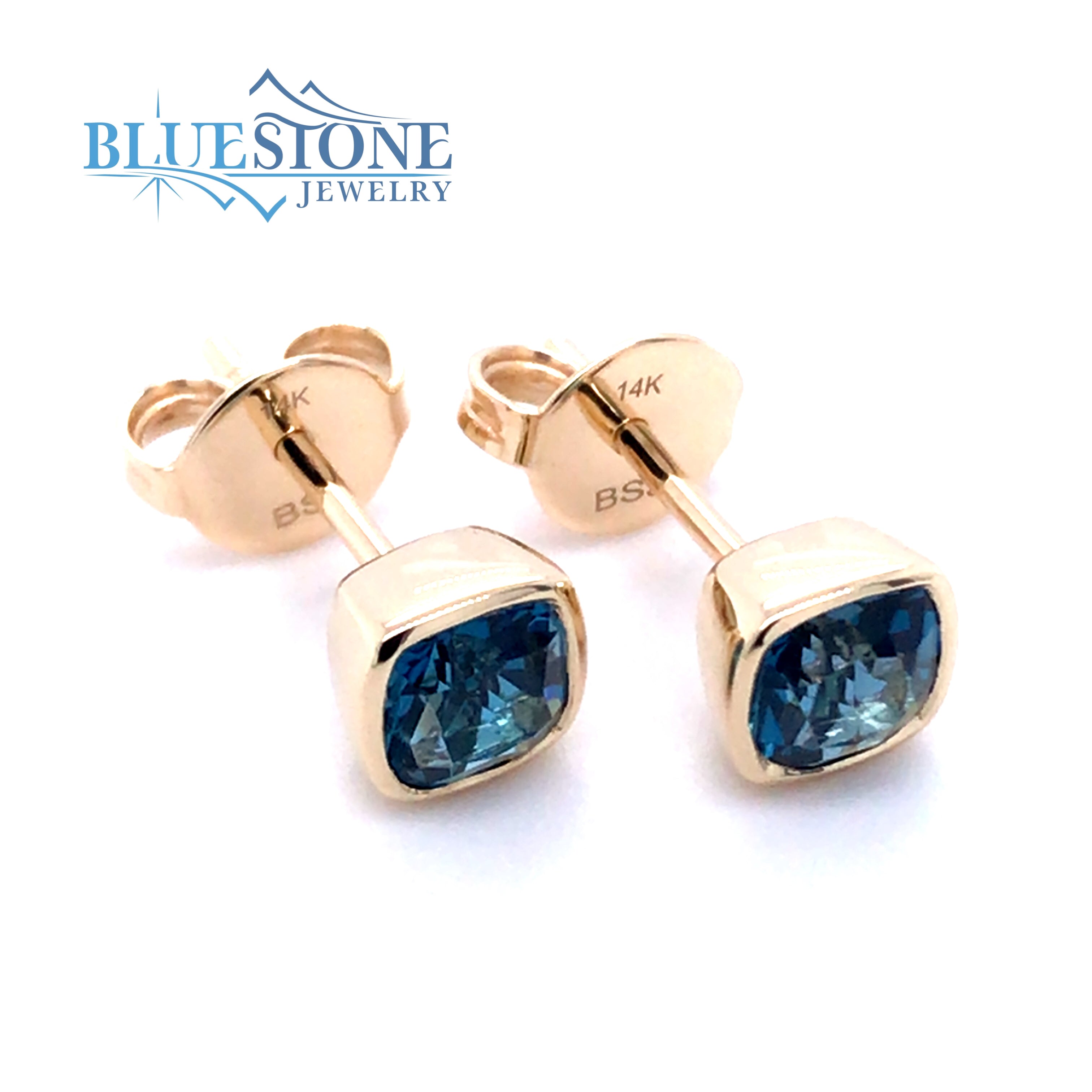 14 Karat Yellow Gold Stud Earrings with Two 5mm Wide Square Cushion Cut London Blue Topaz Gemstones at 1.25 Carats Total Weight. Total Weight of 2.0 Grams. Earrings Measure Approximately 6mm Wide.