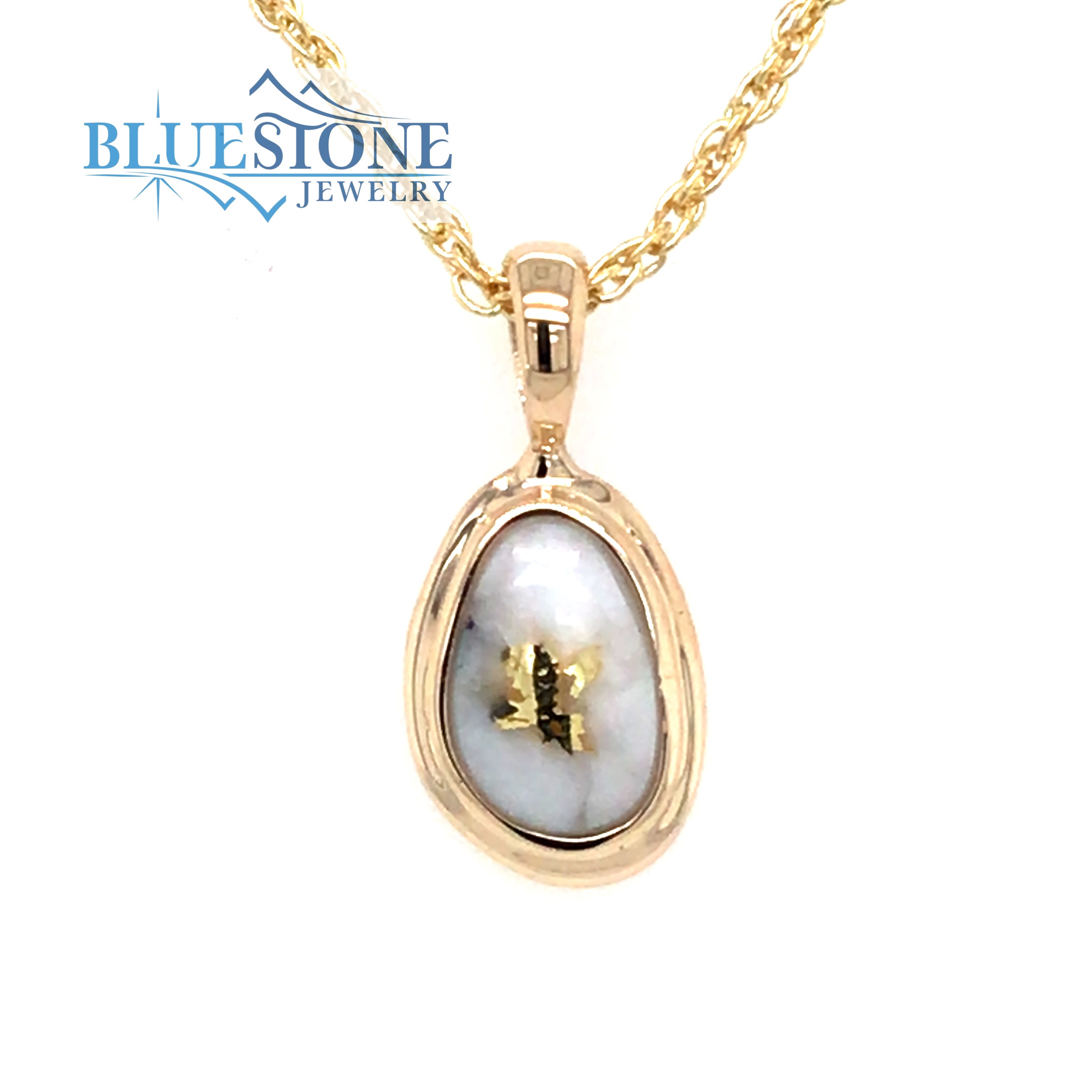 14 Karat Yellow Gold Pendant with a pear shaped Gold Quartz. Pendant measures 8.6mm x 18mm. Gold Quartz found at the local Sixteen to One mine in California since 1896.Comes on an 18 inch Yellow Plated metal alloy DISPLAY chain. It is highly recommended to switch onto a different chain for wearing.*Natural Gold Quartz gemstone appearance may vary from stone to stone*