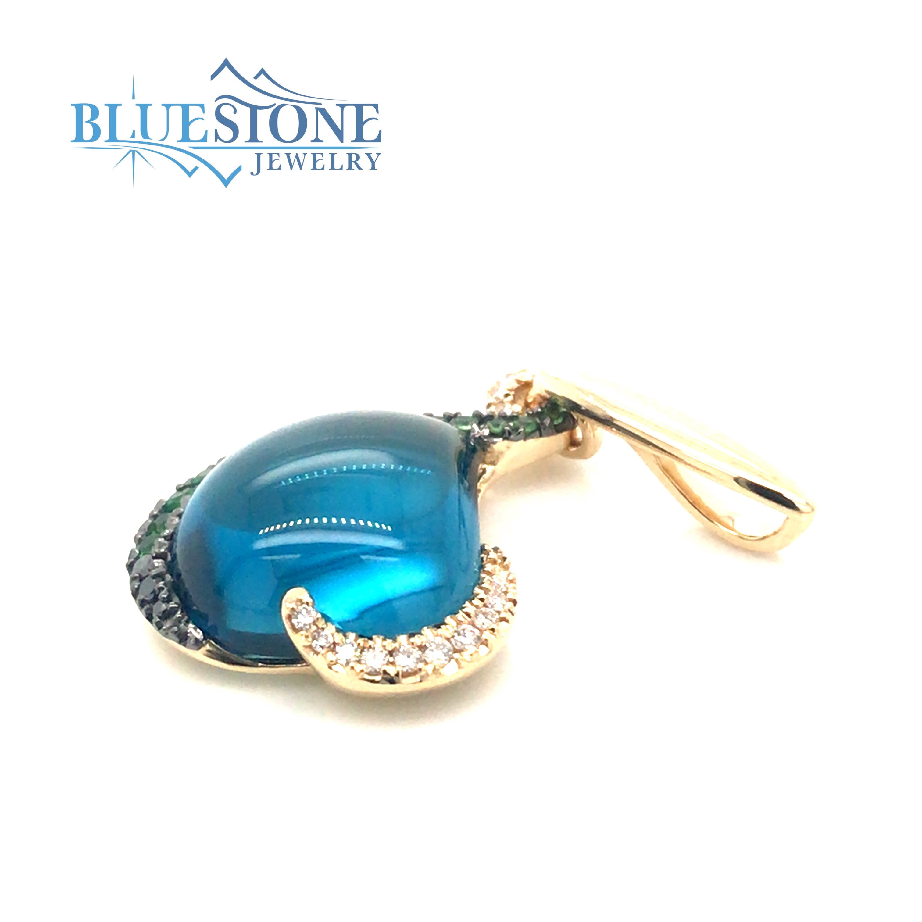 14 Karat Yellow Gold Pendant with One 8.38 Carat Cabochon London Blue Topaz, 16 Round Green Garnets at 0.12 Carats Total Weight, 16 Round Diamonds at 0.06 Carats Total Weight, 3 Round Black Diamonds 0.02 Carats Total Weight.Measures Approximately 5/8" Wide by 1.25" Tall. Bluestone Jewelry Design.Chain Sold Separately. Comes on an 18" metal alloy DISPLAY chain.