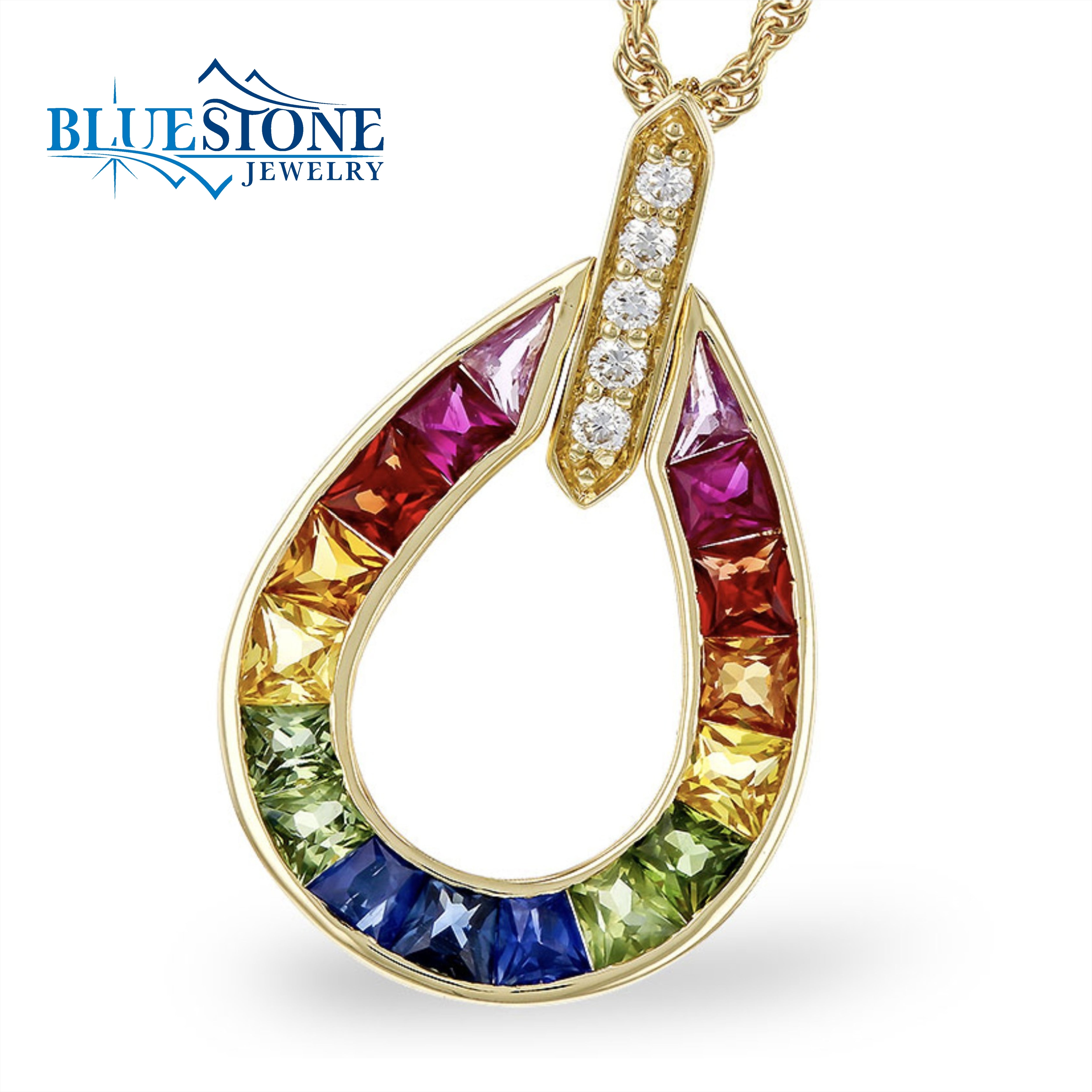 14 Karat Yellow Gold Rainbow Pendant with 17 Multicolored Sapphires at