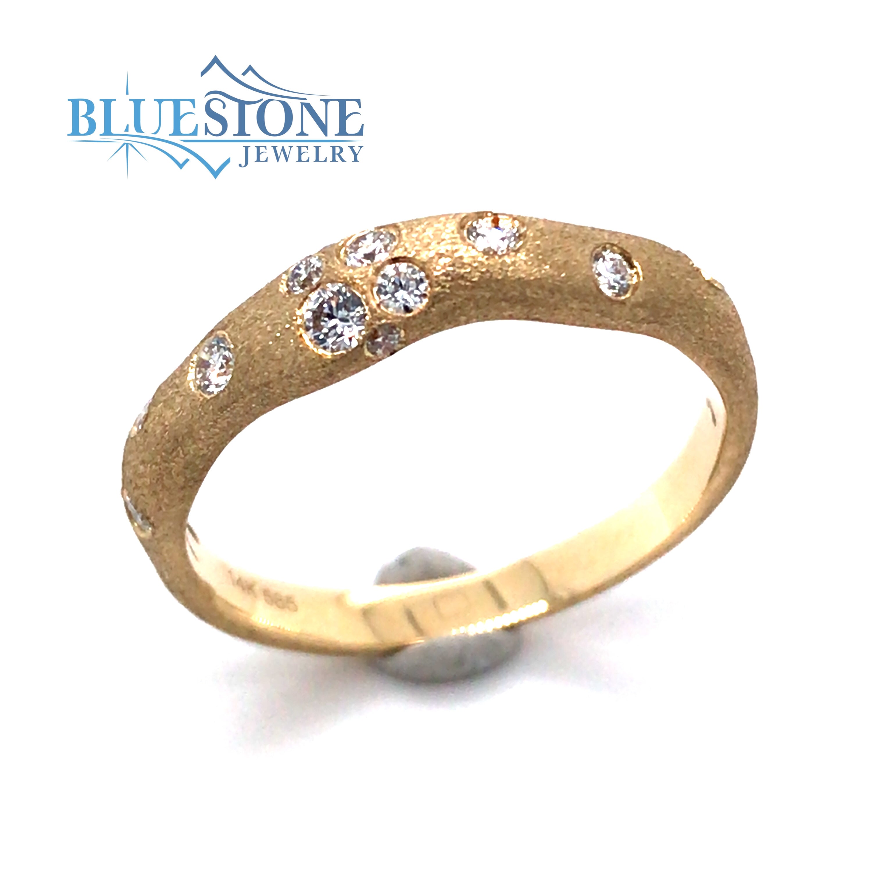 14 Karat Yellow Gold Ring with 11 Round Diamonds at 0.21 Total Carat Weight. Features Satin Metal Finish. Ring size 6.5.