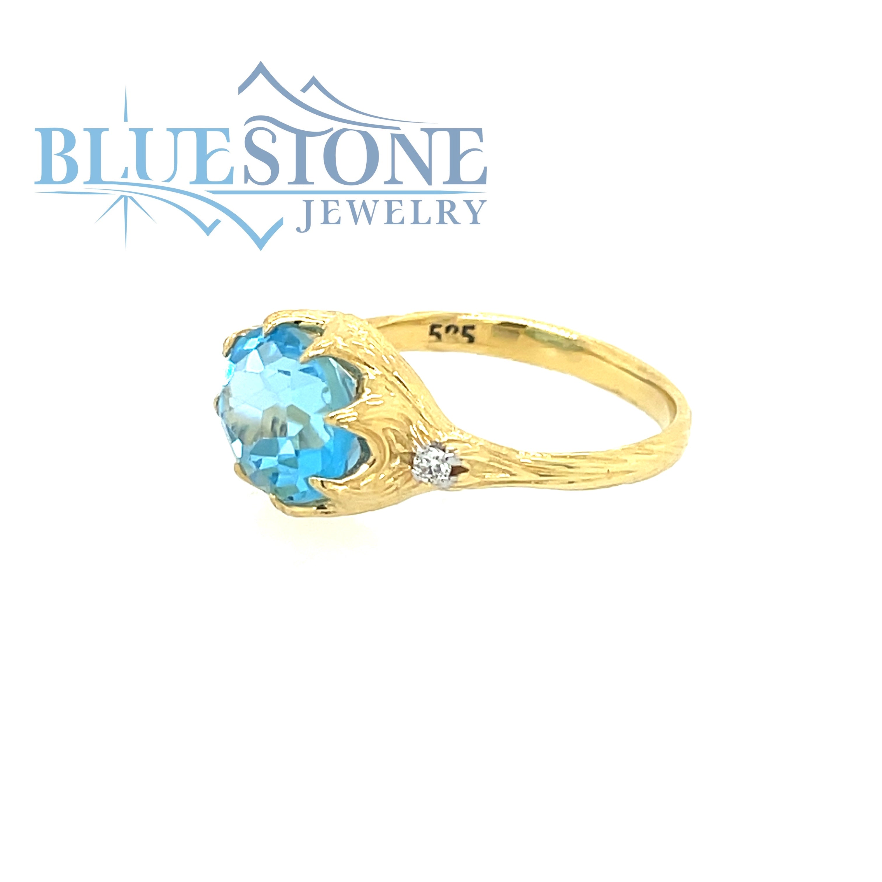 14 Karat Yellow Gold Ring with Blue Topaz gemstone and 2 Round Diamond