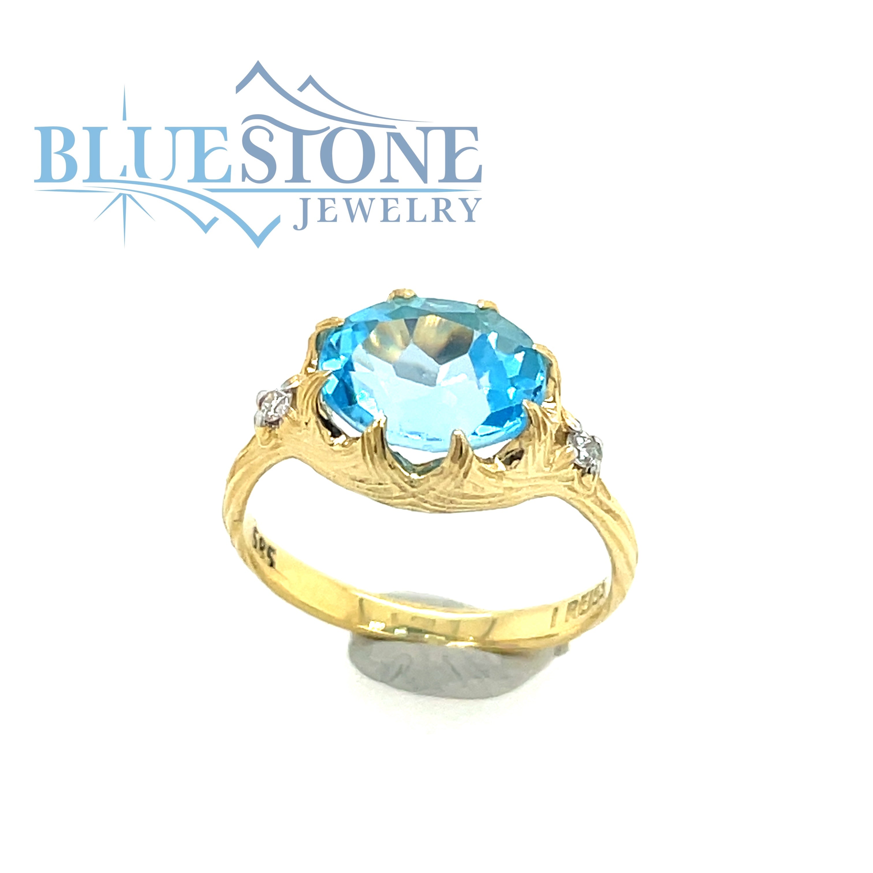 14 Karat Yellow Gold Ring with Blue Topaz gemstone and 2 Round Diamonds at 0.05 Carats Total Weight.Ring Size 7