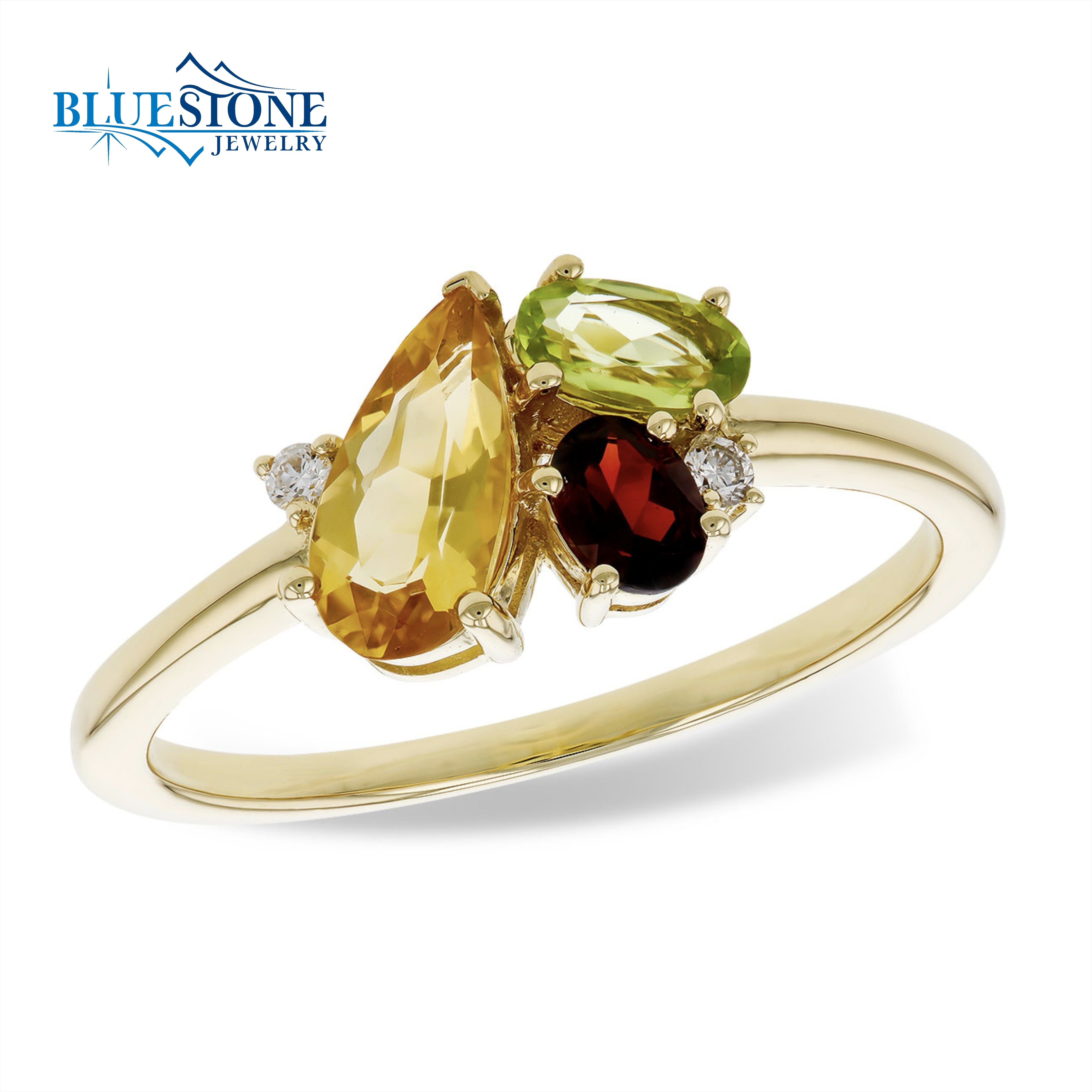 14 Karat Yellow Gold Gemstone Cluster Ring with One Pear Cut Citrine, One Oval Cut Peridot, One Oval Cut Garnet and Two Accent Round SI G Quality Diamonds at 0.03 Total Diamond Weight. Ring Size 7.