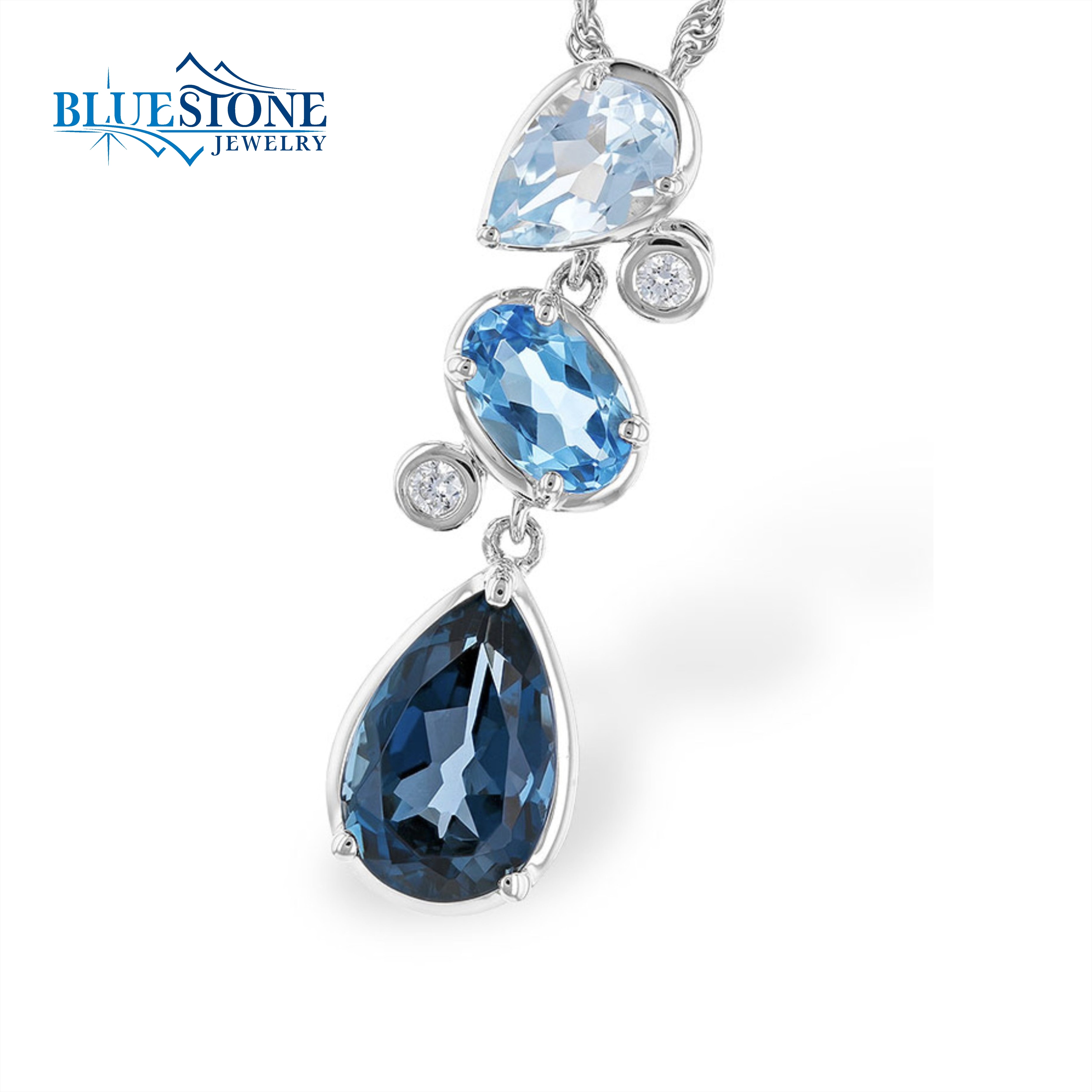 14 Karat White Gold Pendant with London Blue, Sky Blue & Swiss Blue Topaz at 1.99 Carats Total Weight & 2 Round Diamonds at 0.03 Carats Total Weight of G SI1 Quality Diamonds. Measure 1 Inch Long.Chain is Sold Separately. Comes on a Metal Alloy Display Chain.