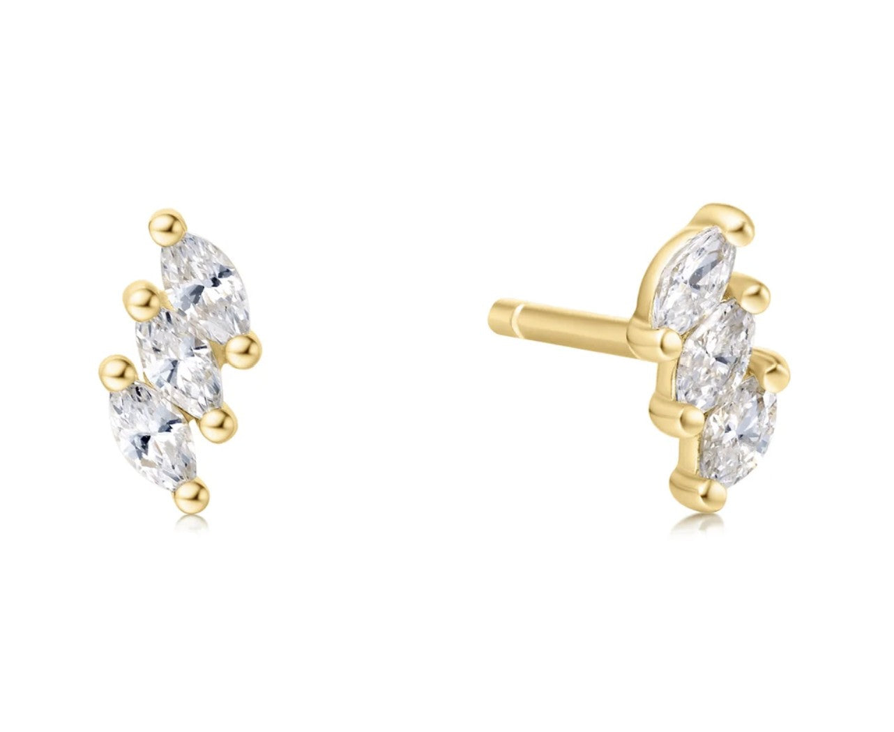 Sterling Silver and 14KT Yellow Gold Plated Stud Earrings With 3 Staggered Marquise Cut Cubic Zirconia Gemstones.One Marquise Cut Cubic Zirconia Gemstone Measures Approximately 3.8mm x 2.8mm.Entire Earrings Measure Approximately 6.5mm x 3.4mm.