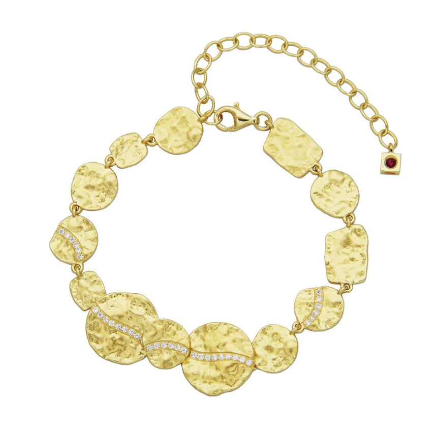 Sterling Silver and 14 Karat Yellow Gold Plated Hammered Disc Bracelet with Stripe of Cubic Zirconia Gemstone Details.Bracelet Measures 6.5" Long With an Additional 2.5" Extender.Bracelet Includes One Hidden Round Created Ruby Which Represents Inner Beauty, Inner Peace & Inner Strength.