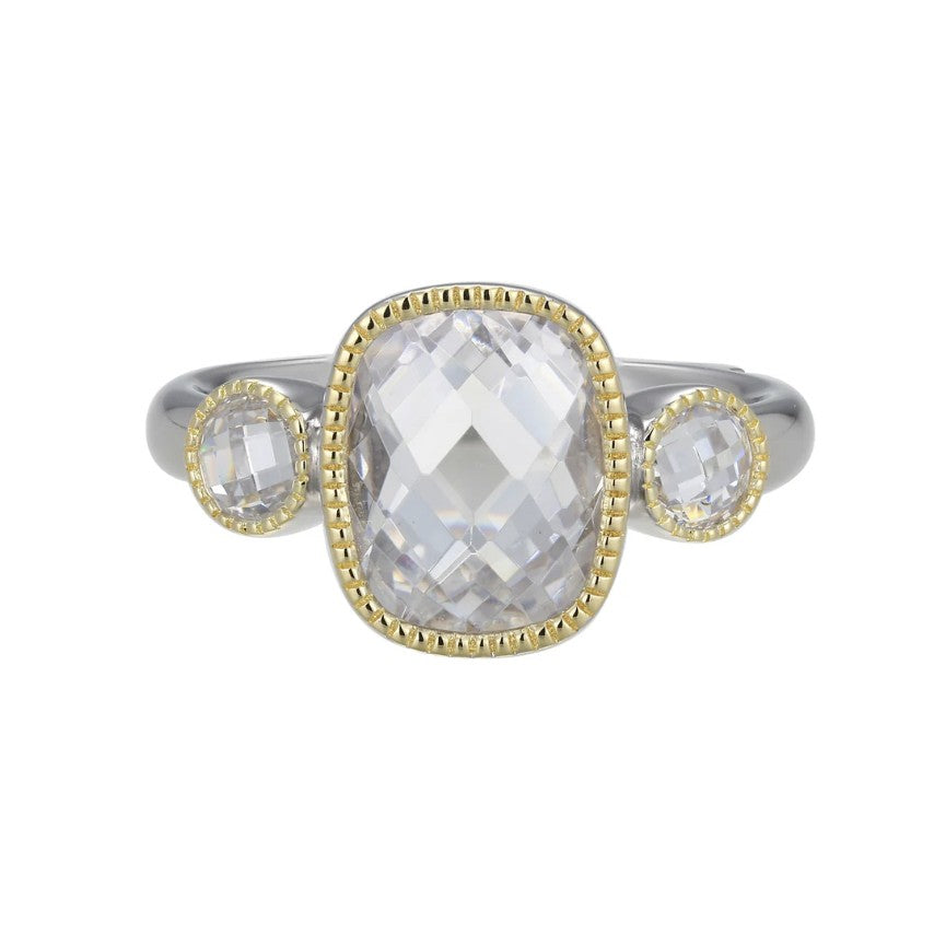Sterling Silver and Rhodium Plated Ring with One Square Cushion Cut and Two Round Cubic Zirconia Gemstones in a 14 Karat Gold Plated Miligrain Bezel Setting. Ring Includes One Hidden Round Created Ruby Which Represents Inner Beauty, Inner Peace & Inner Strength. Ring Size 8.Other Sizes Available, Please Inquire.