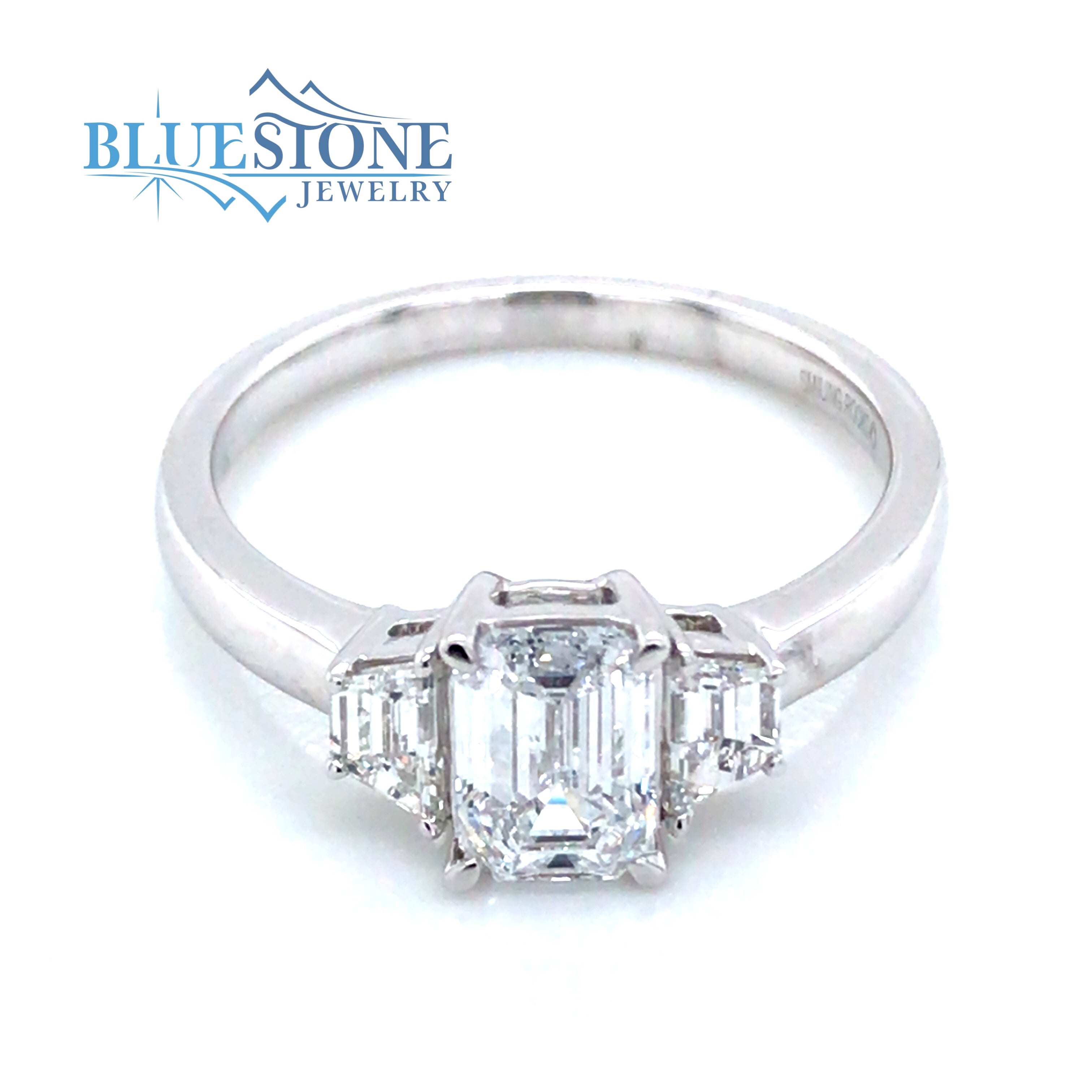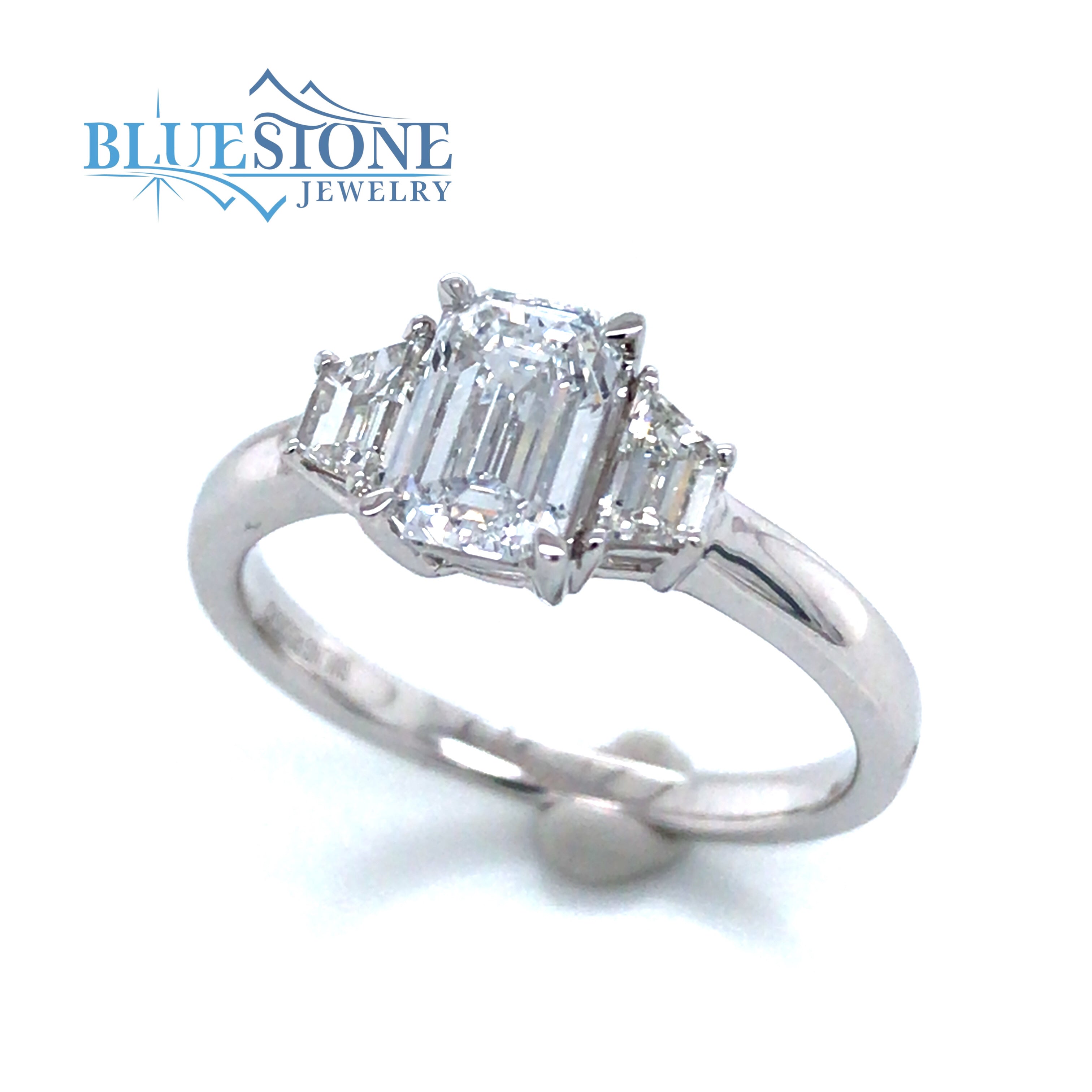 14 Karat White Gold Ring with One7 x 4.7mm 1.00 Carat Emerald Cut Lab Grown Diamond F VS2 Quality and 2 Lab Grown Accent Diamonds at 0.47 Total Carat Weight.Ring Size 7 at 3.2 Grams Total Weight.