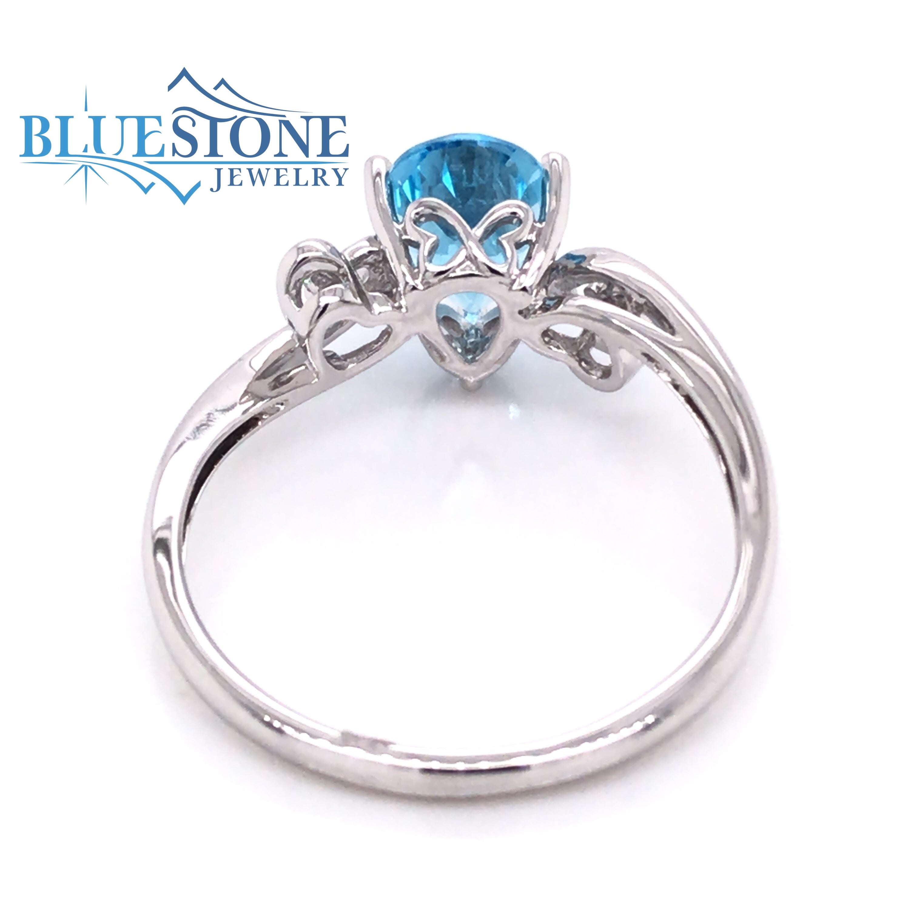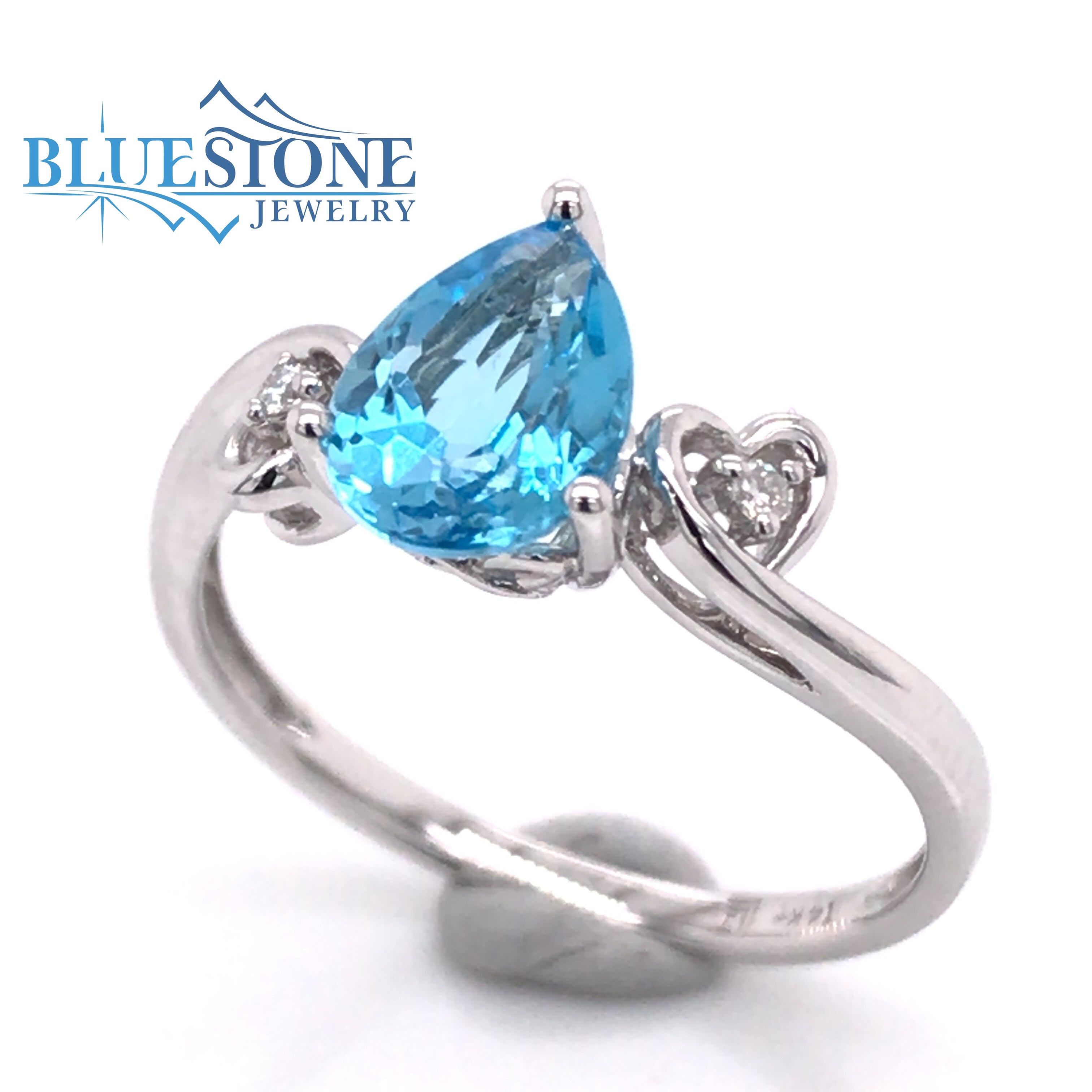14 Karat White Gold Ring with a 1.35 Carat Pear Cut Swiss Blue Topaz and 2 Round Diamonds at 0.02 Carats Total Weight G/H SI Quality Diamond. Features Heart Design Accents.Ring Size 7.