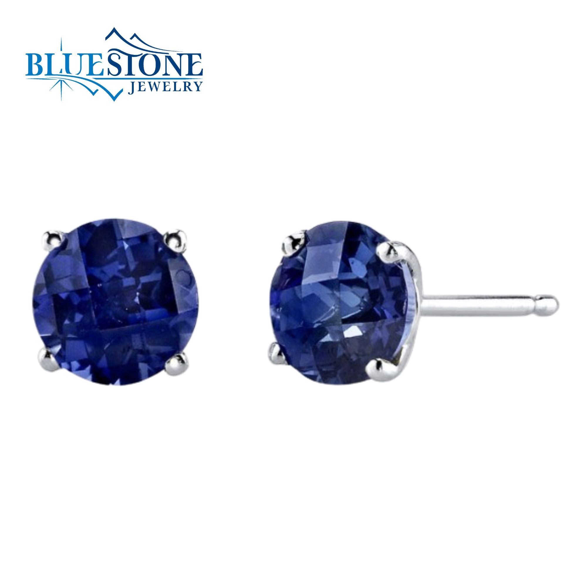 14K White Gold 6mm Round 4 Prong 2.25 Carat Blue Sapphire Earrings.