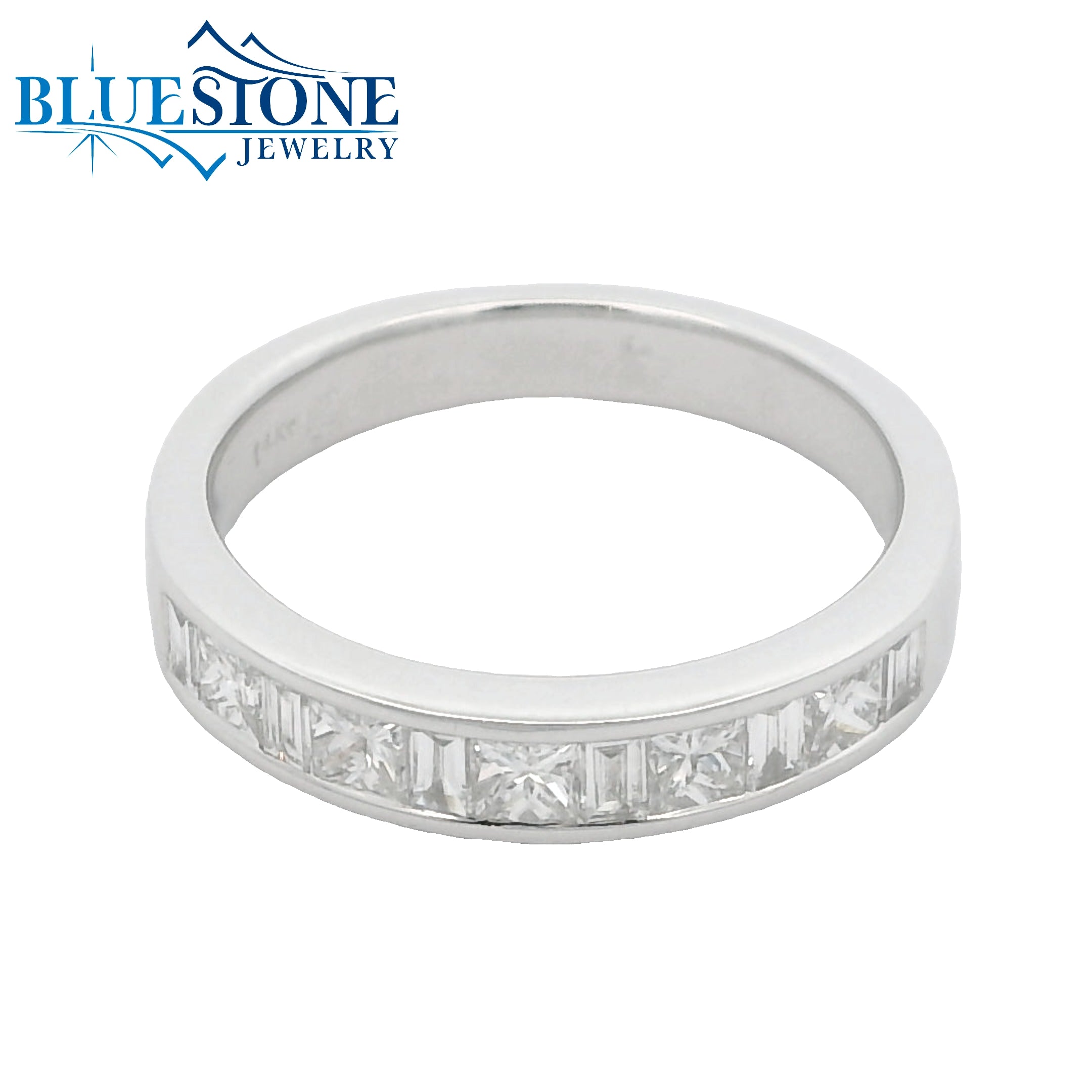 14 Karat White Gold Rhodium Plated Ring with 5 Square Cut Diamonds at 0.49 Carats Total Weight and 6 Baguette Cut Diamonds at 0.24 Carats Total Weight of G VS2 Quality Diamonds. Full Total Weight of 0.73 Carats.Ring Size 7.Can be ordered in other sizes and metal types.