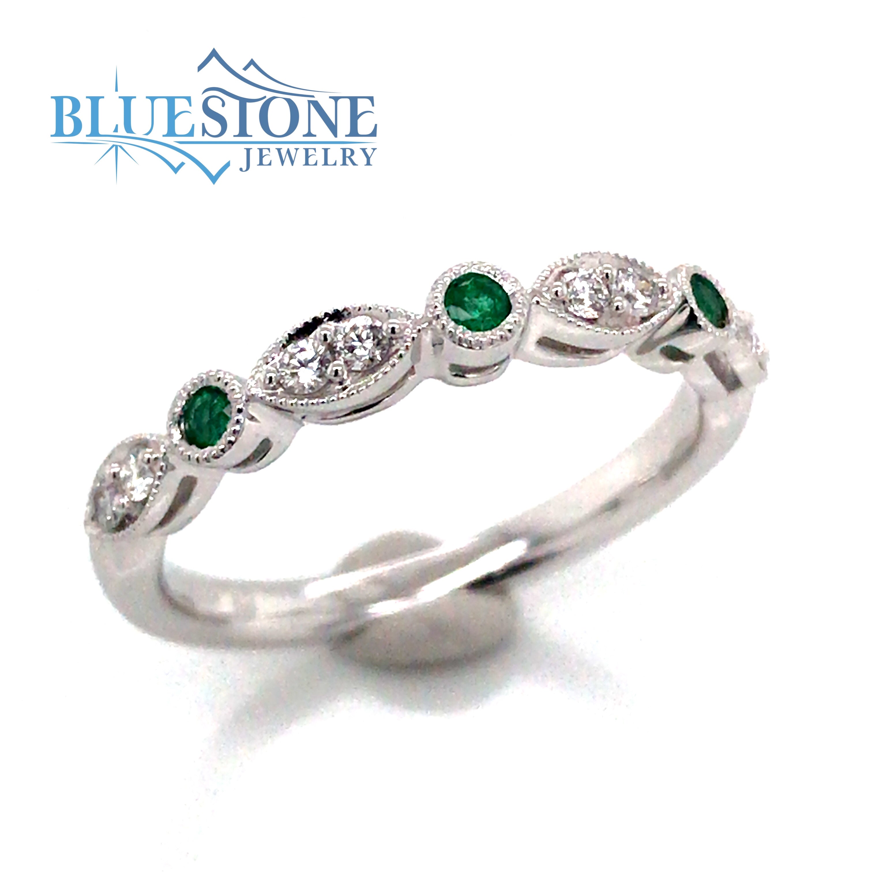 14 Karat White Gold Ring with 3 Round Emeralds at 0.08 Total Carat Weight and 8 Round Diamonds at 0.14 Carats Total Weight of G/H SI Quality Diamonds.Ring Size 7.Can be special ordered in other ring sizes and metal options.
