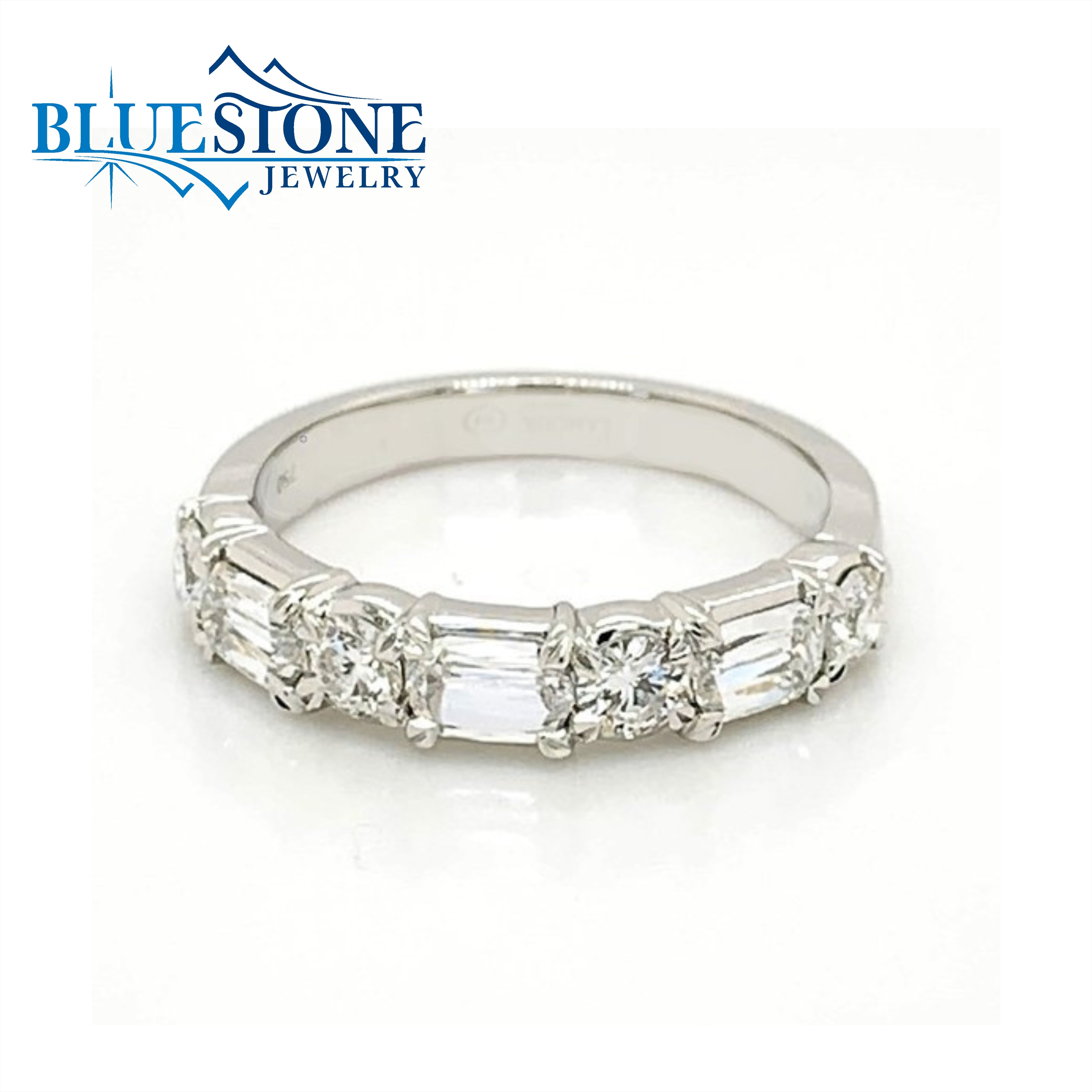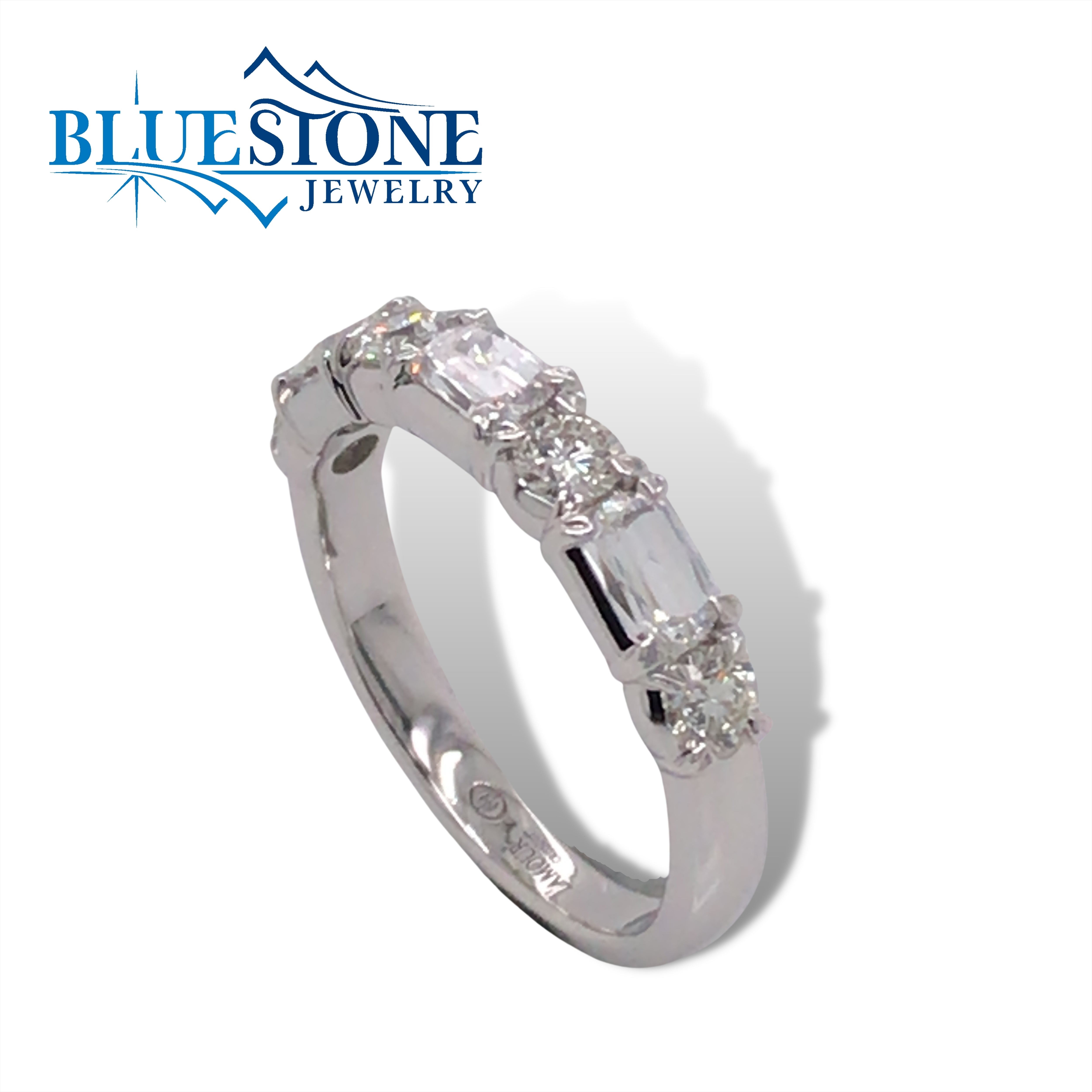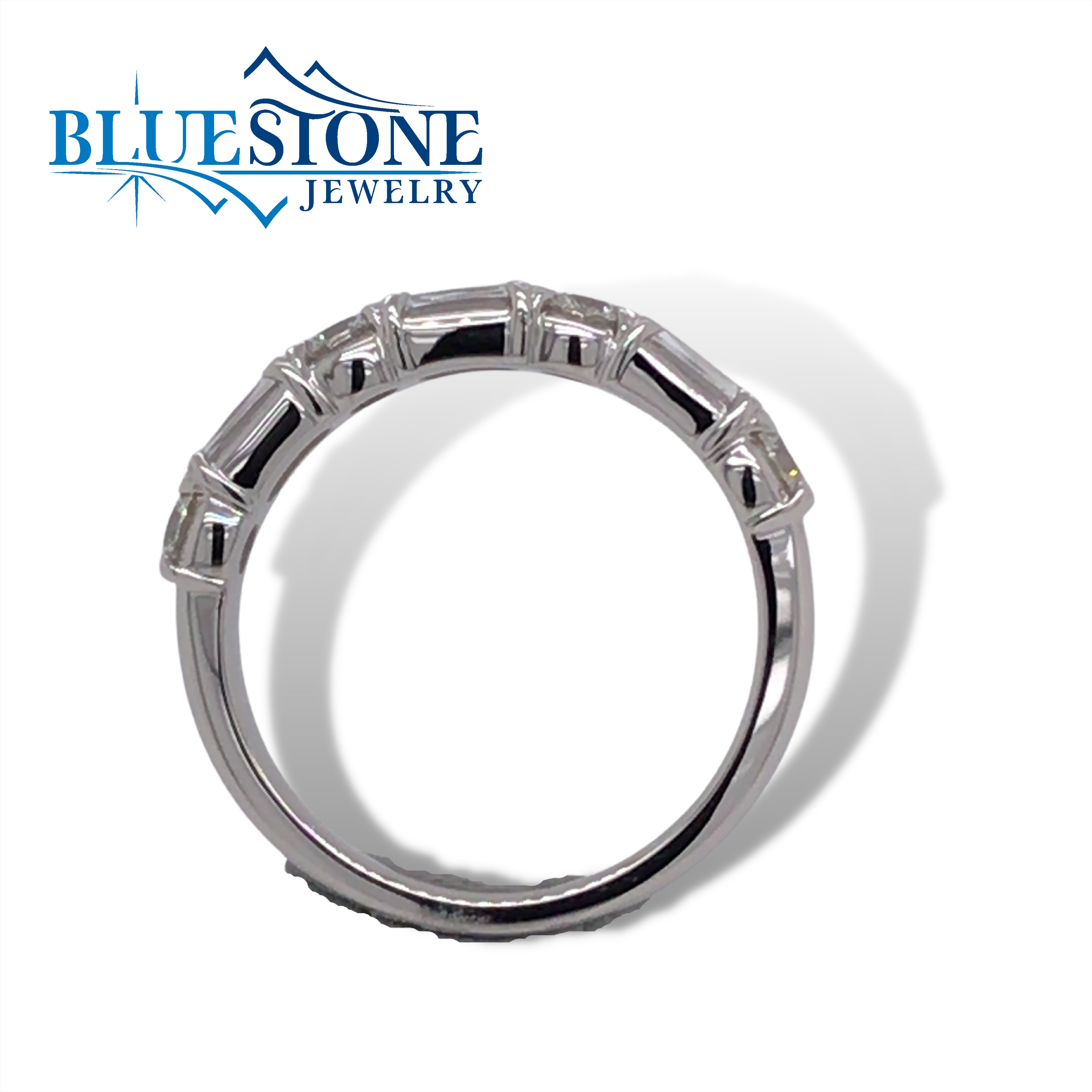 14 Karat White Gold Fashion Ring or Wedding Band with 3 Specialty Oval/Emerald Cut Diamonds at 0.56 Carats Total Weight and 4 Specialty Round Cut Diamonds at 0.46 Carats Total Weight of E VS Quality Diamonds.Ring Size 6.5 at an overall finished weight of 3.5 grams.Serial Number V01735