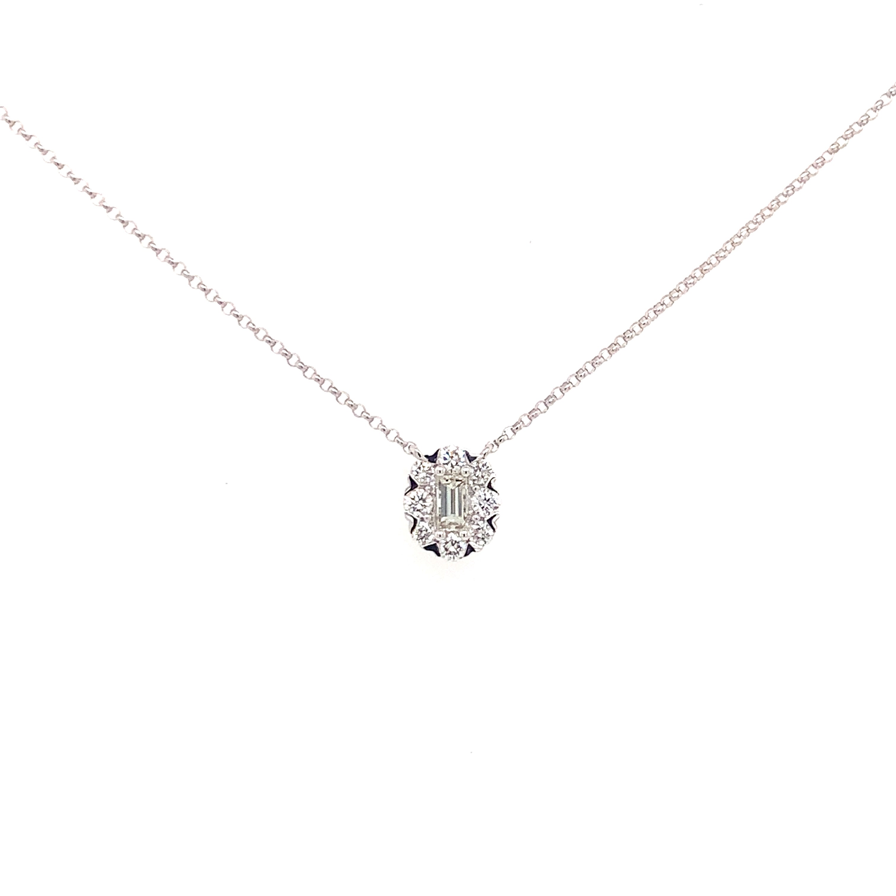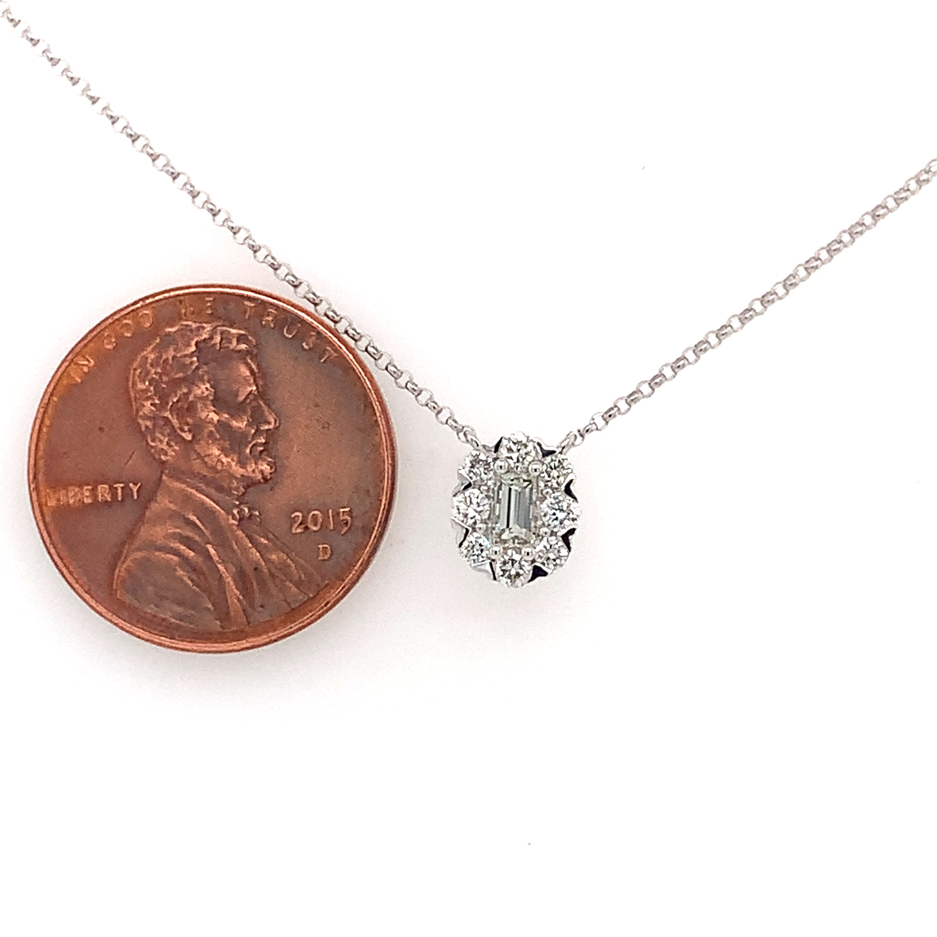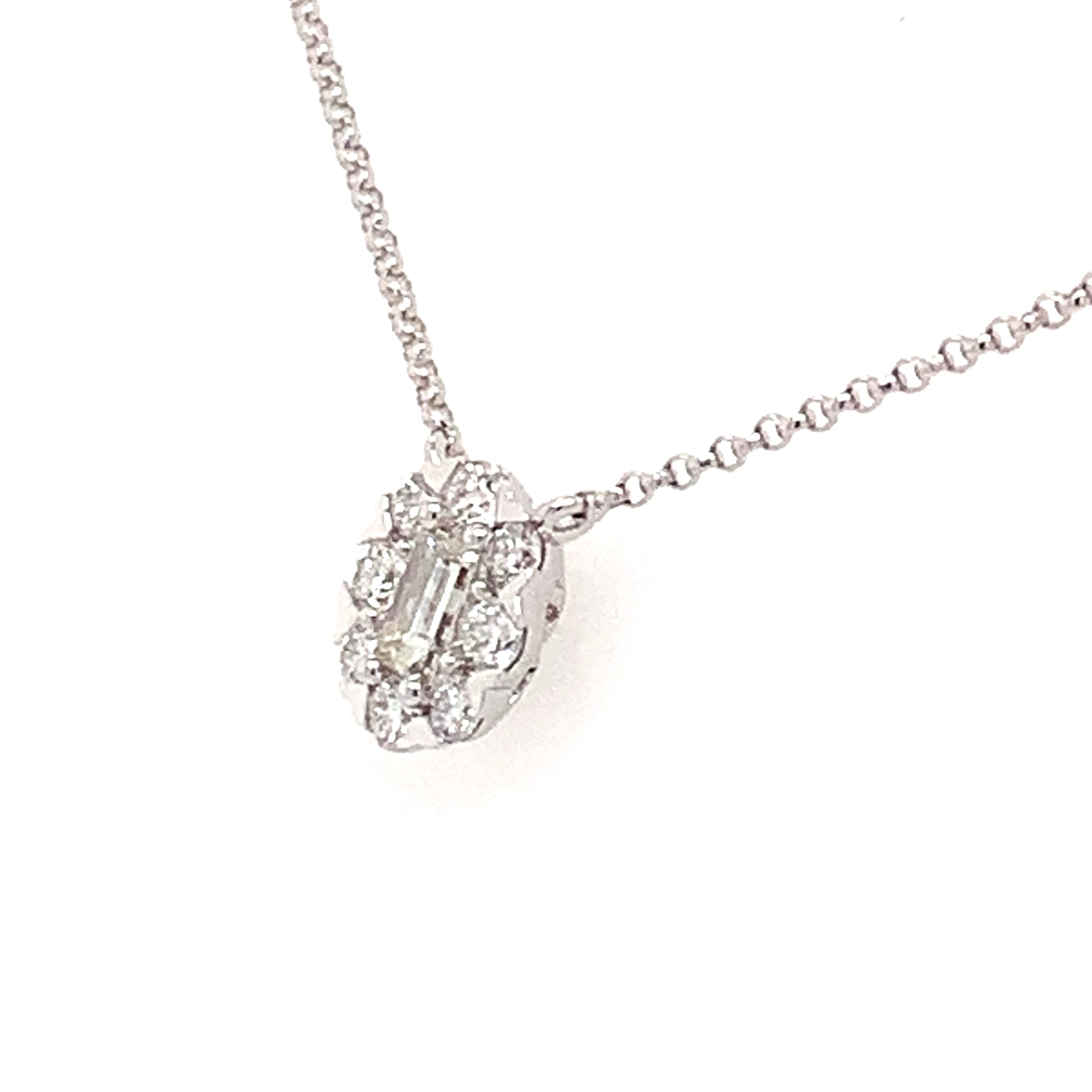 14 Karat White Gold Necklace with 9 Diamonds at 0.36 Carats Total Weight of G/H SI1 Quality. Necklace has a jump ring to clasp at 16 inches and 17 inches.