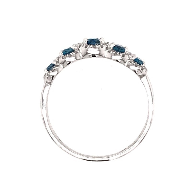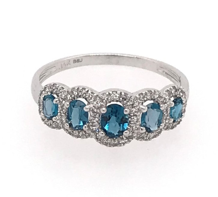 14 Karat White Gold Ring with 5 Oval Cut London Blue Topaz at 0.48 Carats Total Weight & Round Diamonds at 0.11 Carats Total Weight G SI1 Quality Diamonds.Ring Size 7.5 at 1.8 grams overall finished weight