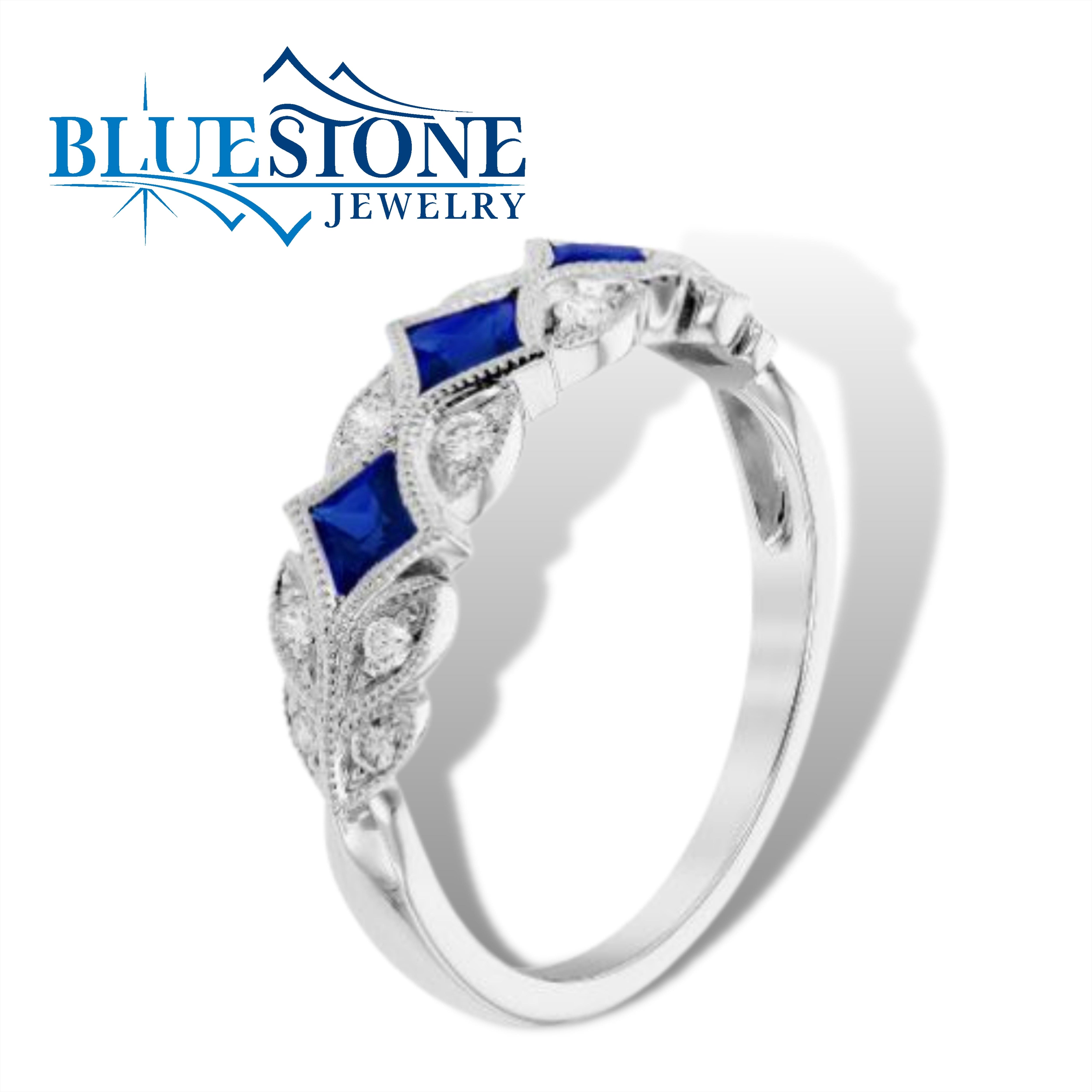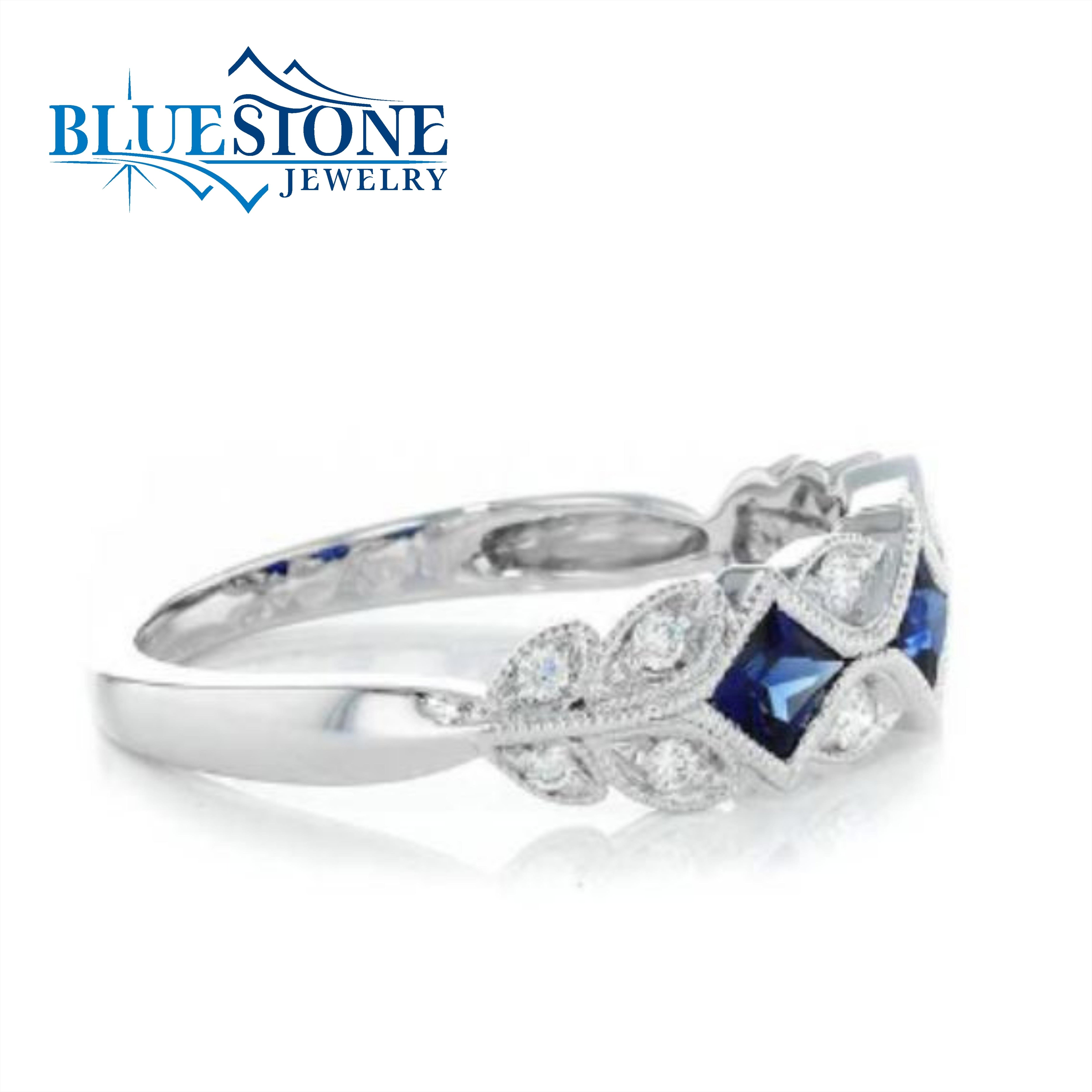 14 Karat White Gold Fashion Ring with 3 Princess Cut Blue Sapphires at a total weight of 0.55 Carats and 12 Round Diamonds at a total weight of 0.15 Carats of G Si1 Quality Diamonds.Ring Size 7