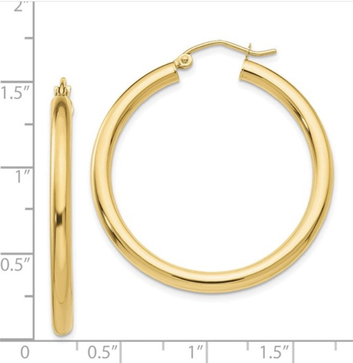 14 Karat Yellow Gold 3mm Tube Hoop Earrings by 35mm tall