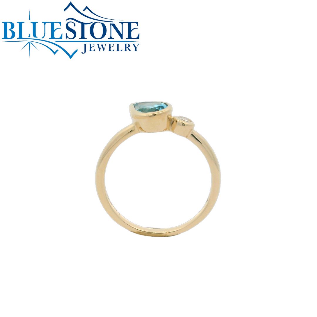 14 Karat Yellow Gold Ring with One Bezel Set 7mm x 5mm Pear Cut Blue Topaz and One Bezel Set Round Natural Diamonds at 0.05 Carats Total Weight G SI Quality Diamonds. Ring Size 6.75 at 2.6 Grams Total Finished Weight.