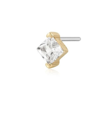 14 Karat Yellow Gold Single Flat Back Stud Earring with One Princess Cut White Sapphire Gemstone Set in 2 Prongs. White Sapphire Measures 2.5mm x 2.5mm.Earring Measures 4.1mm x 3.3mm.