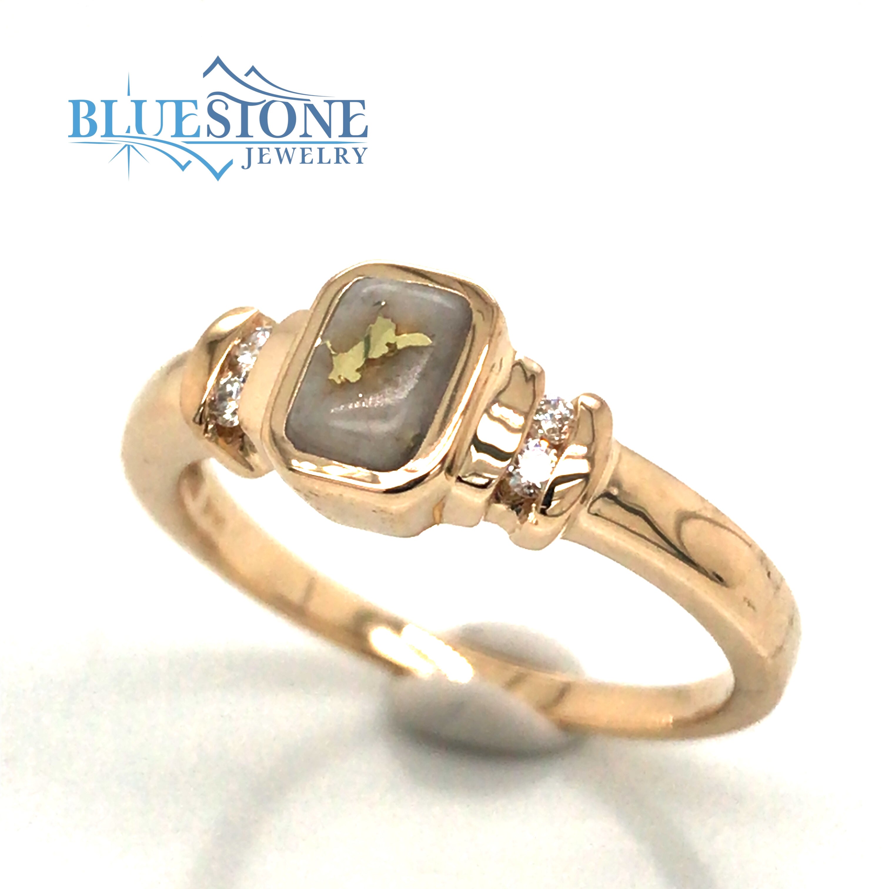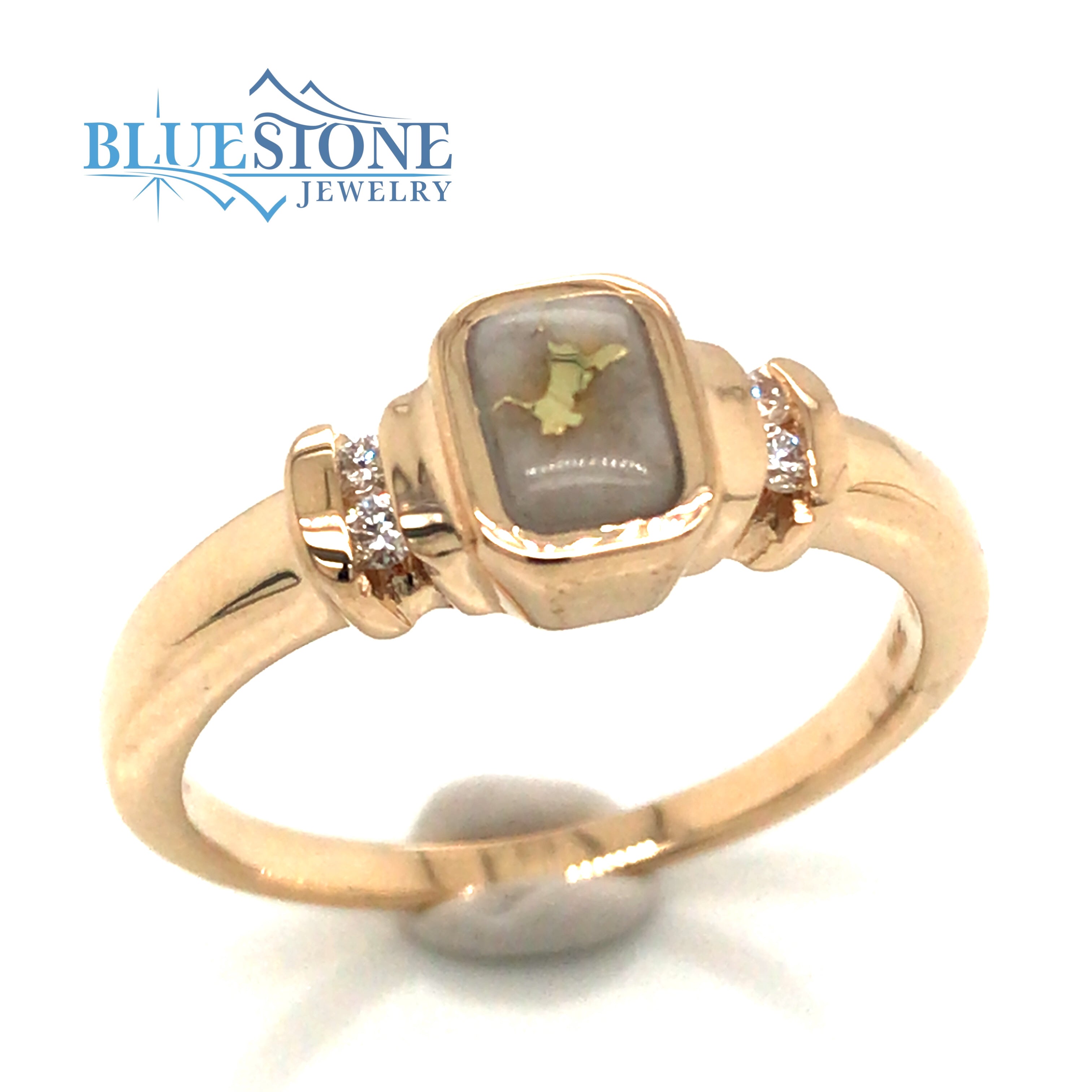 14 Karat Yellow Gold Ring with a 6x4mm Rectangle Gold Quartz from the local Sixteen to One Mine within the Tahoe National Forest and 4 Round Diamonds at 0.02 Carats Total Weight.Ring Size 7.25.Can be special ordered or re-sized per request. Please contact for details.*Natural Gold Quartz gemstone appearance may vary from stone to stone*
