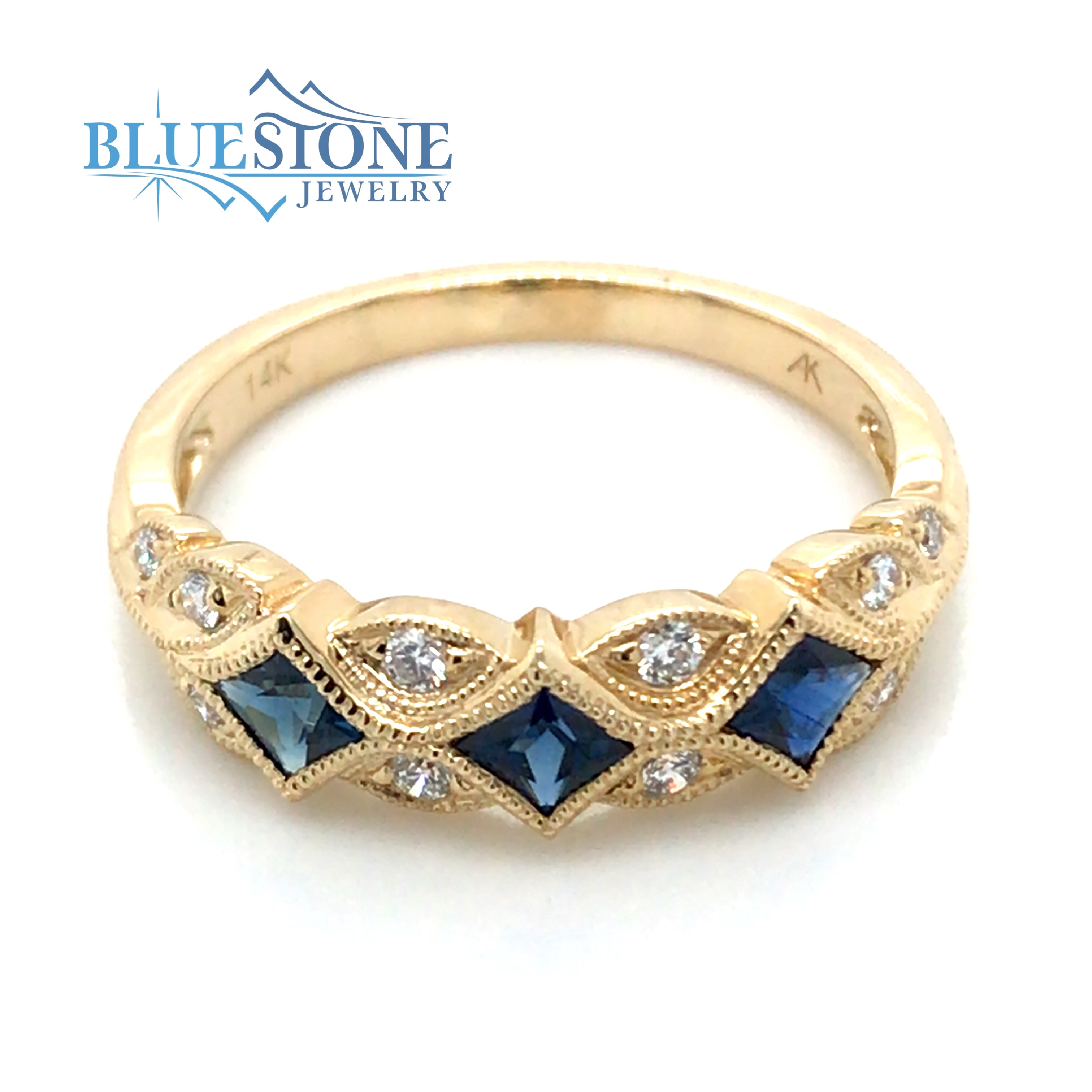 14 Karat Yellow Gold Fashion Ring with 3 Princess Cut Blue Sapphires at a total weight of 0.55 Carats and 12 Round Diamonds at a total weight of 0.15 Carats of G Si1 Quality Diamonds.Ring Size 7