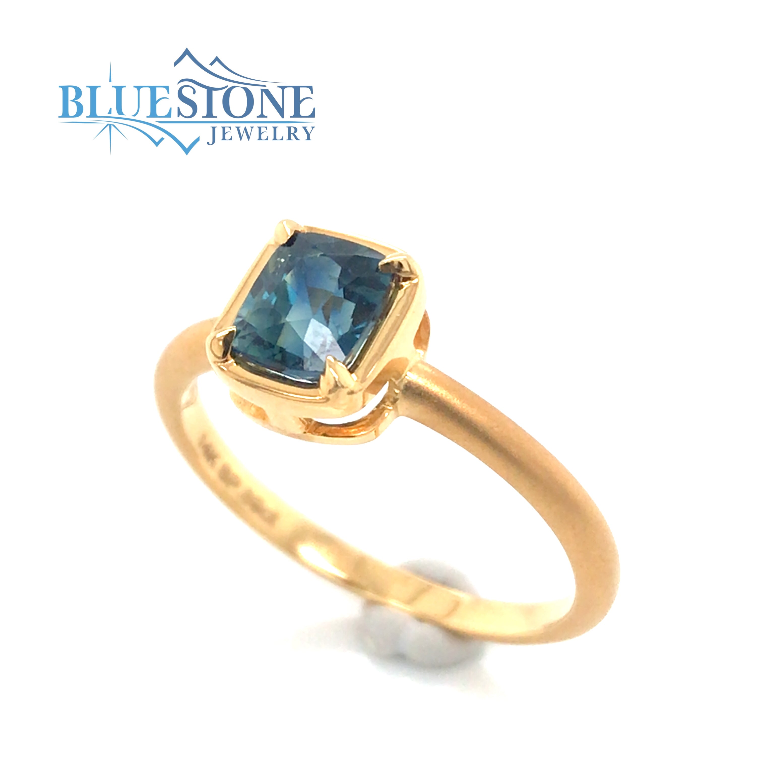 14 Karat Yellow Gold Ring with a 0.89 Carat Cushion Cut Teal Blue Green Natural Sapphire from Kenya/Tanzania.Ring Size 6.25 at an overall finished weight of 2.3 grams. Satin/Brushed Metal Finish