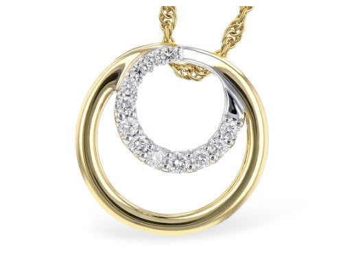 14 Karat Yellow and White Gold Circle Pendant with 12 Round Natural Diamonds at G SI3 Quality. Total Carat Weight of 0.15 Carats. Pendant Measures 15.3mm.Chain is sold separately. Comes on a metal alloy DISPLAY chain.Is available in other metal options.